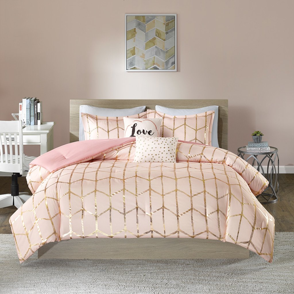 Freshen up your bedroom with the enchanting style of Intelligent Design's Raina Comforter Set. The stunning comforter flaunts a geometric, metallic gold print against a soft blush ground for a fun and eye-catching look! Matching sham(s) echo the design seen on top of the bed to pull the entire ensemble together. Two embroidered decorative pillows with typography and metallic details complete this fabulous, ultra-soft microfiber comforter set. Set includes comforter, 2 shams (1 sham in Twin/TwinXL), 1 oblong and 1 square decorative pillows. This bedding set uses an antimicrobial treatment that provides built-in freshness protection, reducing the growth of odor causing bacteria to keep fabric lasting longer. Items in the set may come in a rolled or compressed packaging, which will need to be fluffed up or steam ironed before use to remove wrinkles.