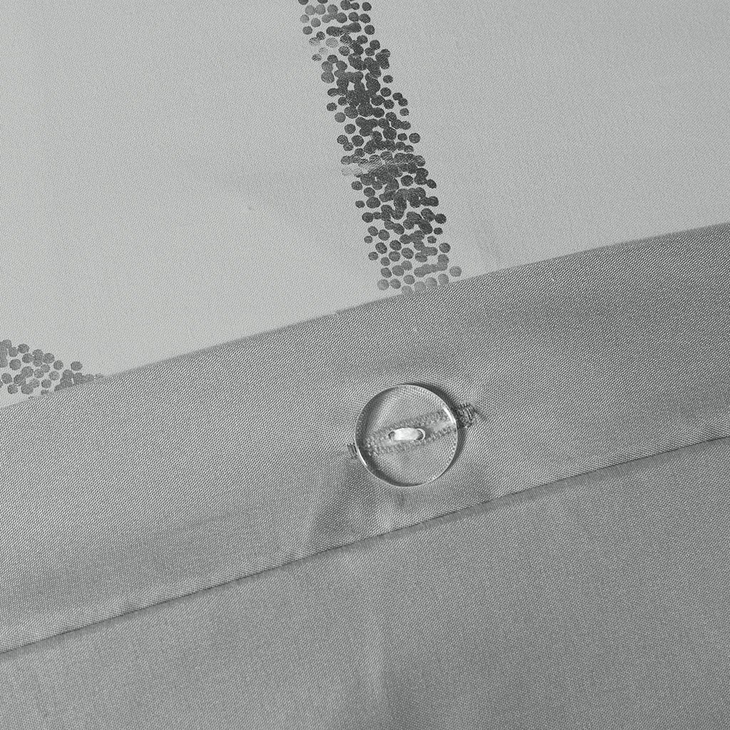 Freshen up your bedroom with the enchanting style of Intelligent Design's Raina Printed Duvet Cover Set. The stunning duvet cover flaunts a geometric, metallic silver print against a soft grey ground for a fun and eye-catching look! Matching sham(s) echo the design seen on top of bed and pulls the entire ensemble together. Two embroidered decorative pillows with typography and metallic details complete this fabulous duvet cover set. This bedding set uses an antimicrobial treatment that provides built-in freshness protection, reducing the growth of odor causing bacteria to keep fabric lasting longer. Button closures allow you to place a comforter insert within the duvet cover and internal corner ties prevent it from shifting.