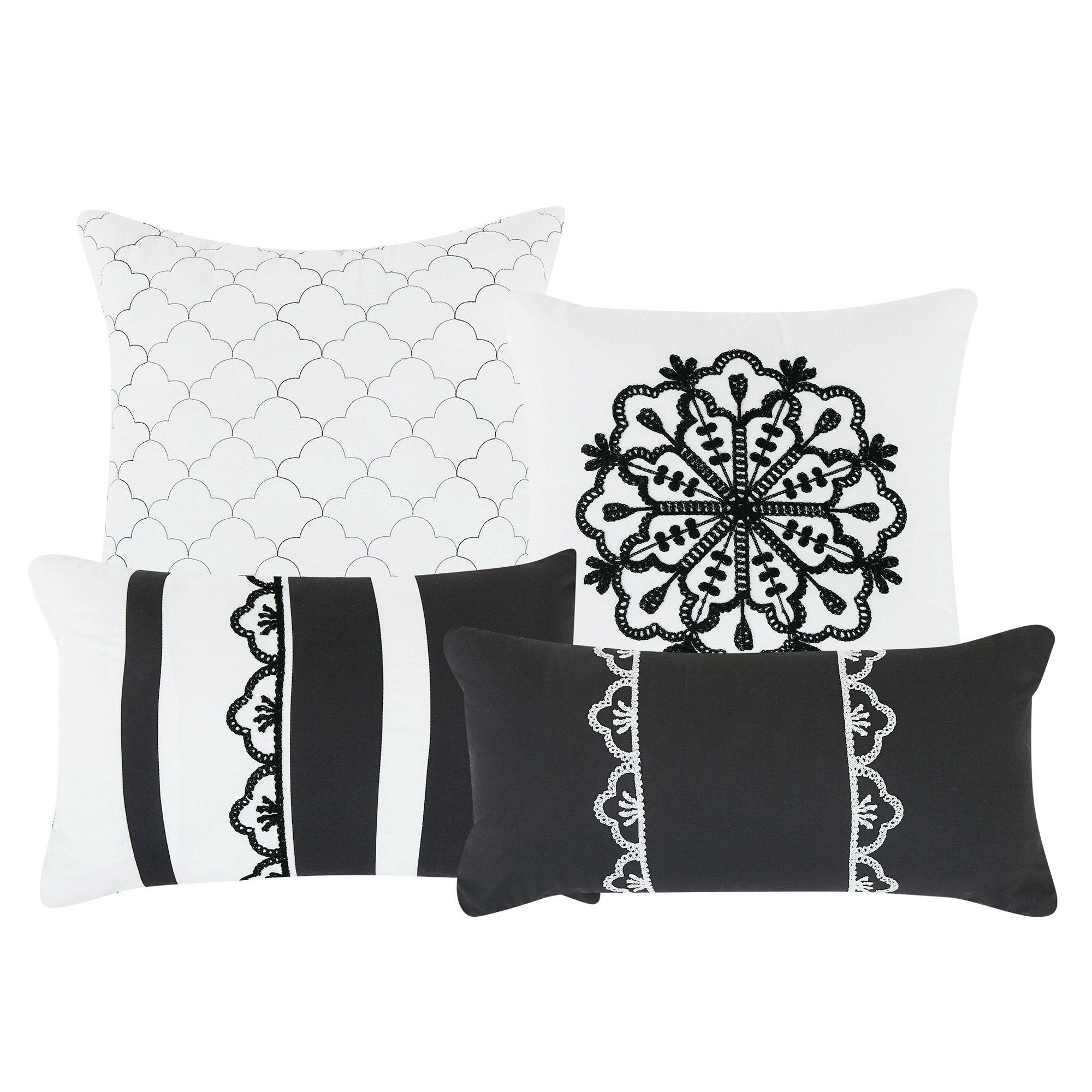| Update your bedroom with the Beautiful motif 7-Piece Comforter Set for a modern look. King Size Dimensions: Comforter: 104 x 90 inches Pillow shams: 20 x 36+1 inches Cushion 1: 16 x 16 inches Cushion 2: 16 x 16 inches Cushion 3: 9 x 20 inches Breakfast Pillow 12 x 18 inches Material: Polyester. Machine washable and tumble dry low |