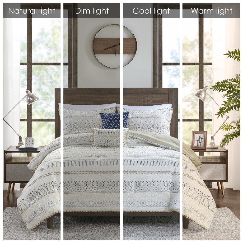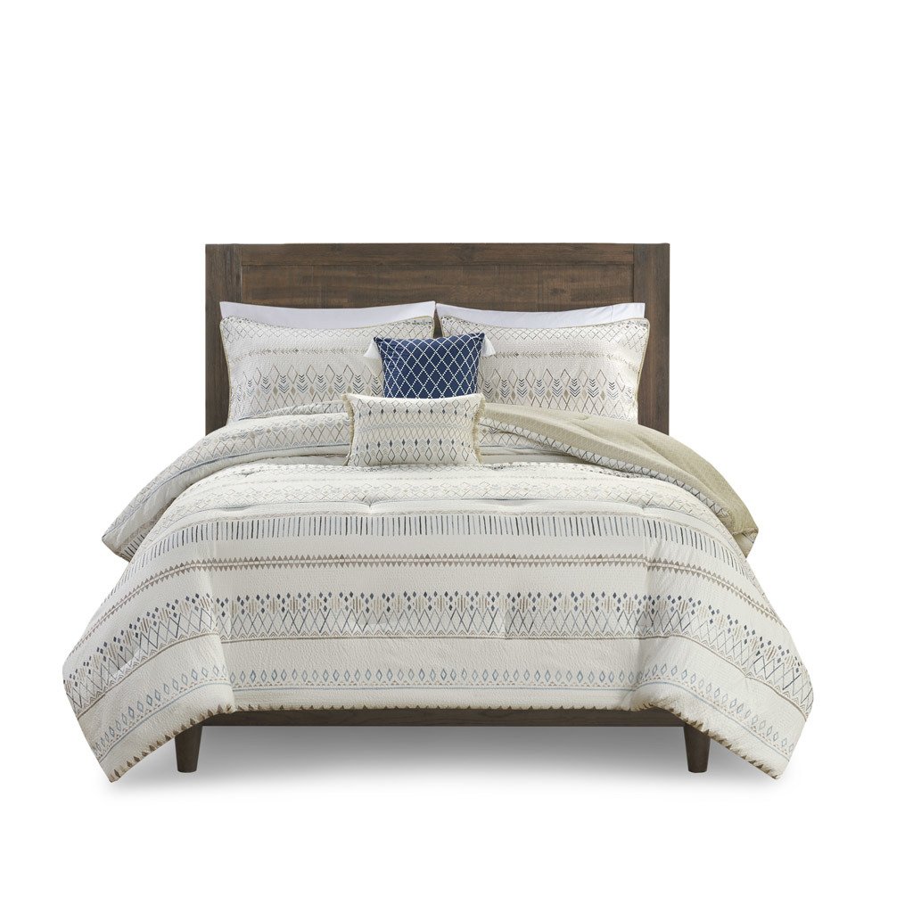 Soft and lightweight, the Madison Park Fraser comforter set brings a Southwest inspired touch to your bed. A diamond print in soft blue and taupe colors adorns the light beige face, while a taupe diamond print on the reverse adds a complementary farmhouse look. This set includes a comforter, 2 shams, and 2 decorative pillows with tassels or fringe to tie back into the bedding. This reversible comforter also features an antimicrobial treatment to help reduce the growth of odor causing bacteria and keep the fabric lasting longer. This set is machine washable in a large capacity commercial washer/dryer for best care.
