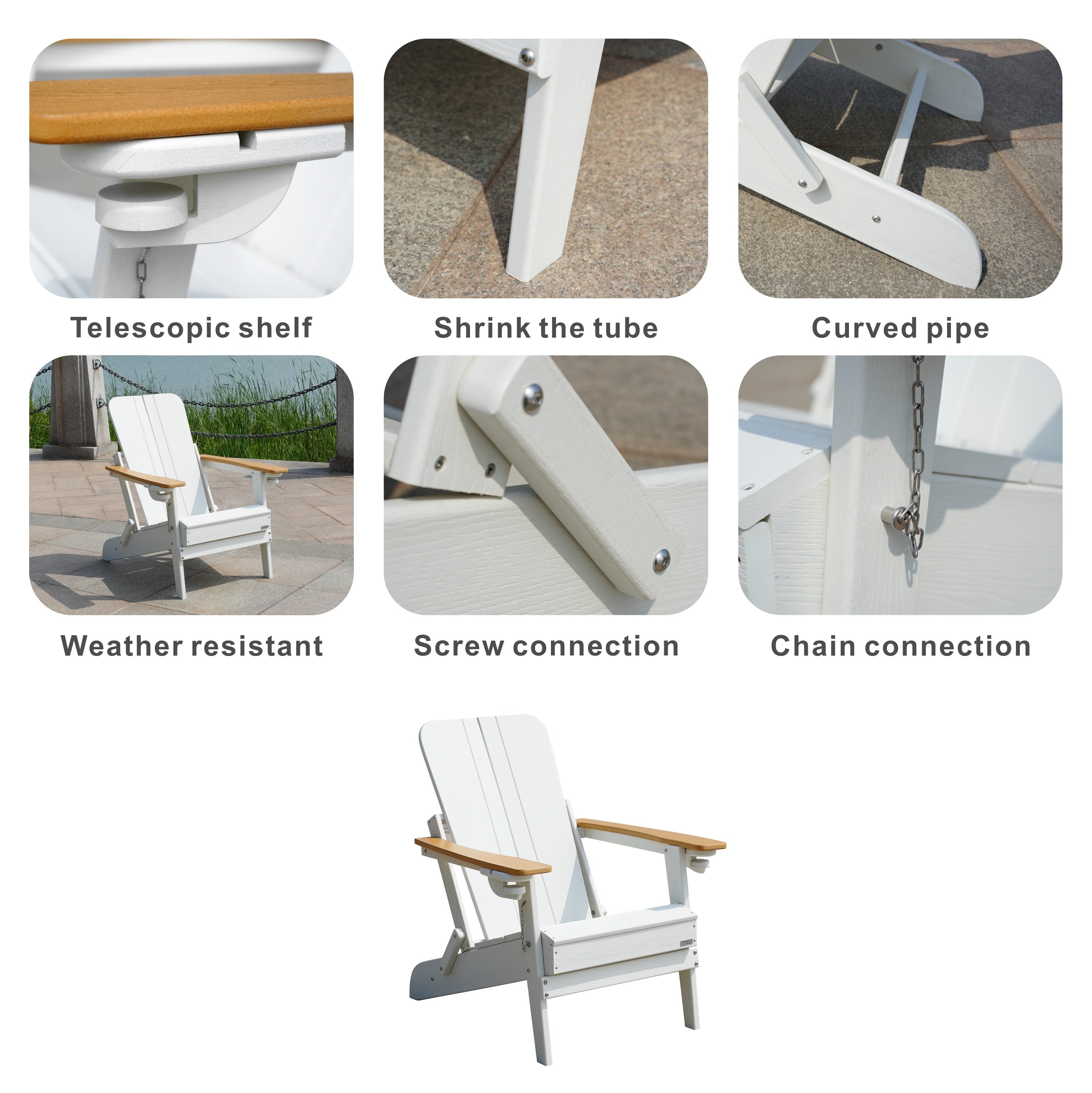 Experience ultimate comfort and convenience with our HDPE Adirondack Chair, available in five vibrant colors. Designed for both style and functionality, this chair features teak color accents on the armrests of the white and gray versions, while the other colors maintain a sleek, uniform appearance. The multifunctional armrests come equipped with cup holders and phone slots, making it the perfect addition to any outdoor space. Measuring 35.4 inch W x 30.7 inch D x 37.4 inch H, this chair offers ample seating space with a seat width of 20.87", seat depth of 19.29", and a comfortable seat height of 14.57". Enjoy the blend of style, durability, and practicality with this Adirondack chair.