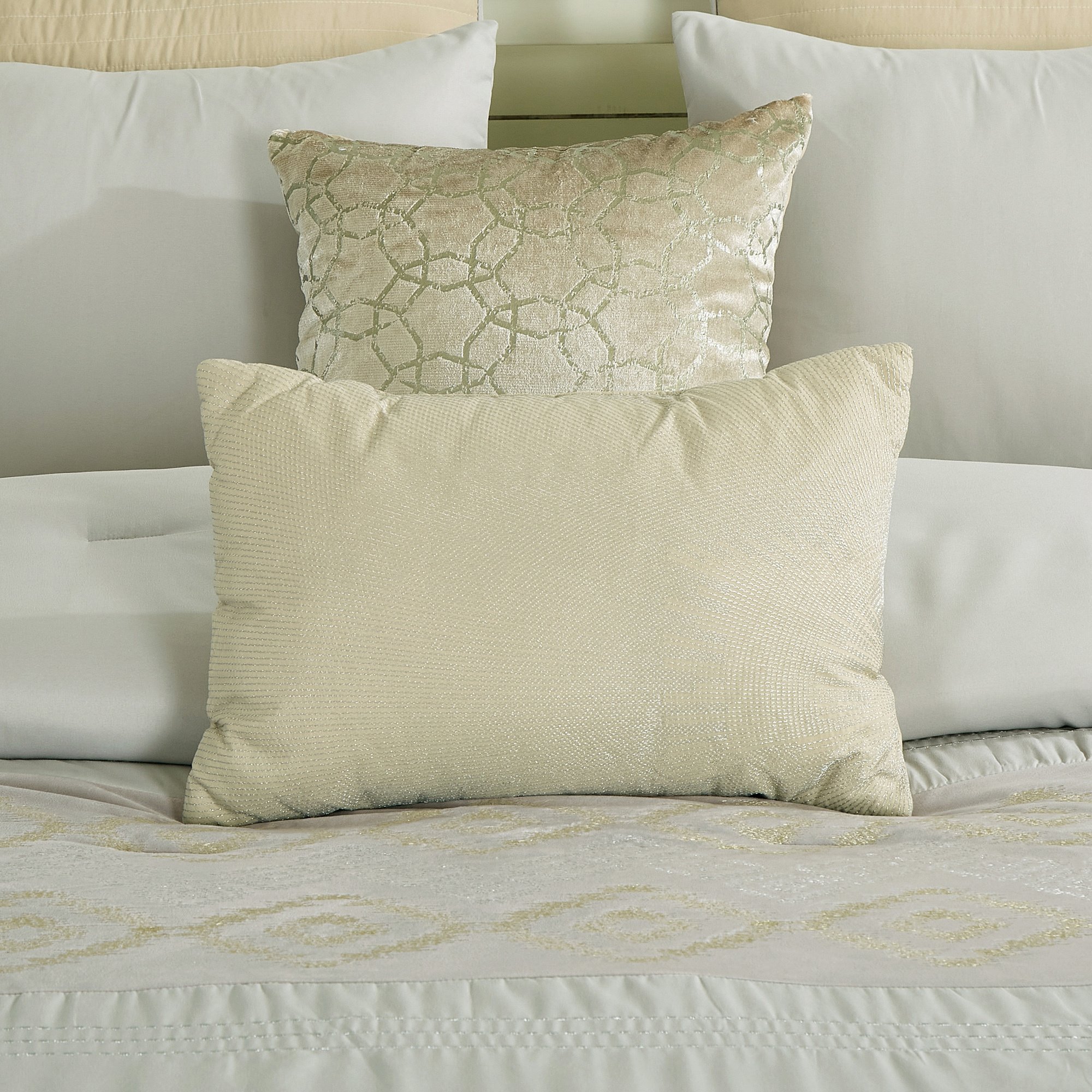 | Update your bedroom with the Beautiful motif 7-Piece Comforter Set for a modern look. Queen Size Dimensions: Queen Comforter: 90 x 90 inches Pillow Shams: 20 x 26+1 inches Cushion 1:12 x 18 inches Cushion 2: 16 x 16 inches Cushion 3: 16 x 16 inches Bed skirt: 60x80+14inches Material: Polyester. Machine washable and tumble dry low |