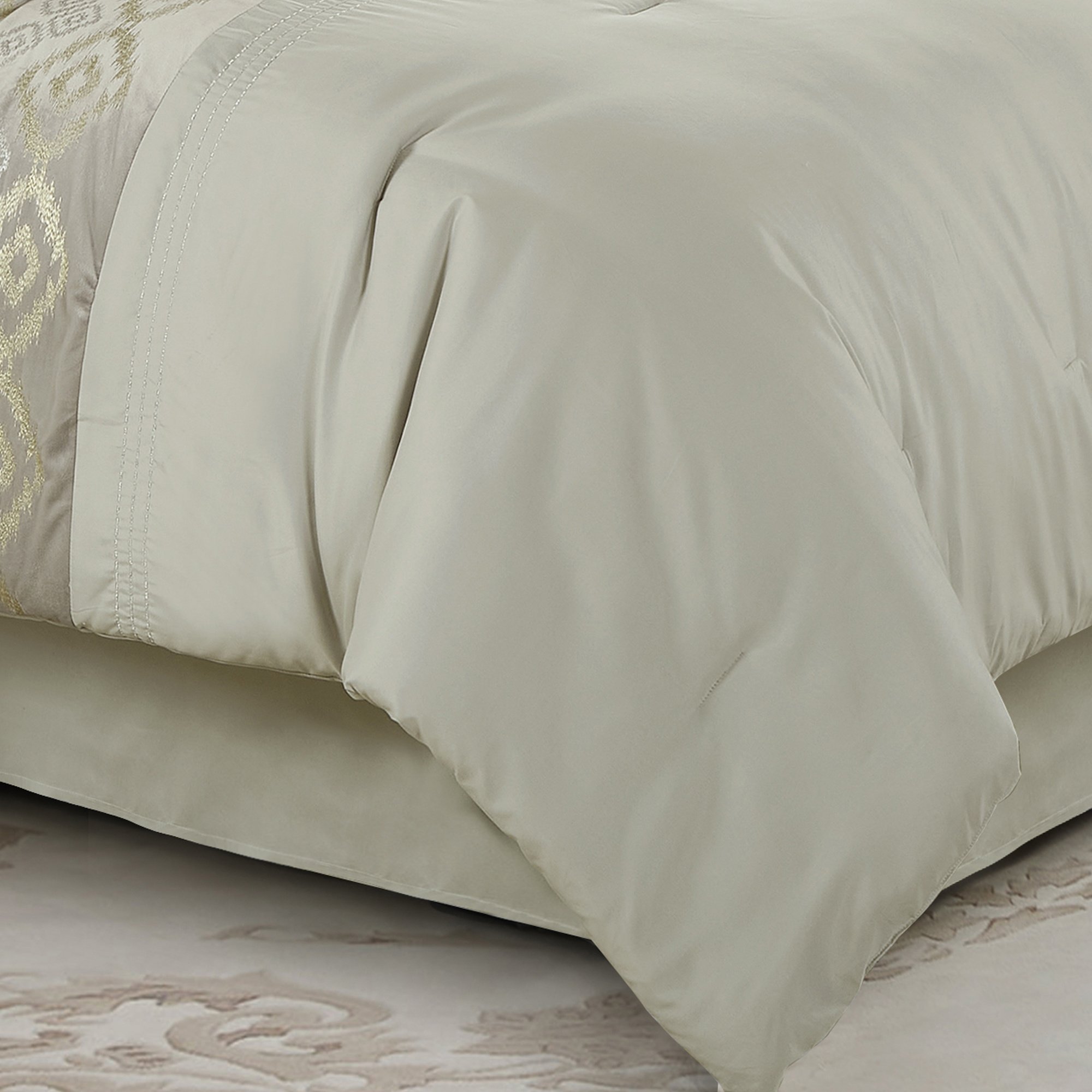 | Update your bedroom with the Beautiful motif 7-Piece Comforter Set for a modern look. King Size Dimensions: Comforter: 104 x 90 inches Pillow shams: 20 x 36+1 inches Cushion 1:12 x 18 inches Cushion 2: 16 x 16 inches Cushion 3: 16 x 16 inches Bed skirt: 72x84+14inches Material: Polyester. Machine washable and tumble dry low |