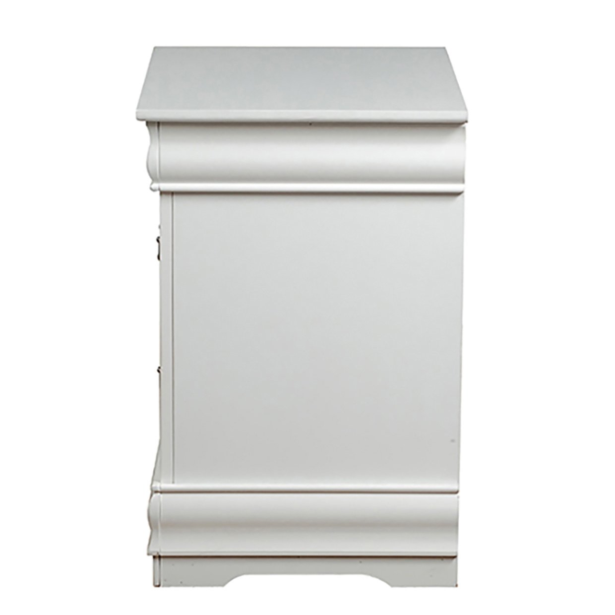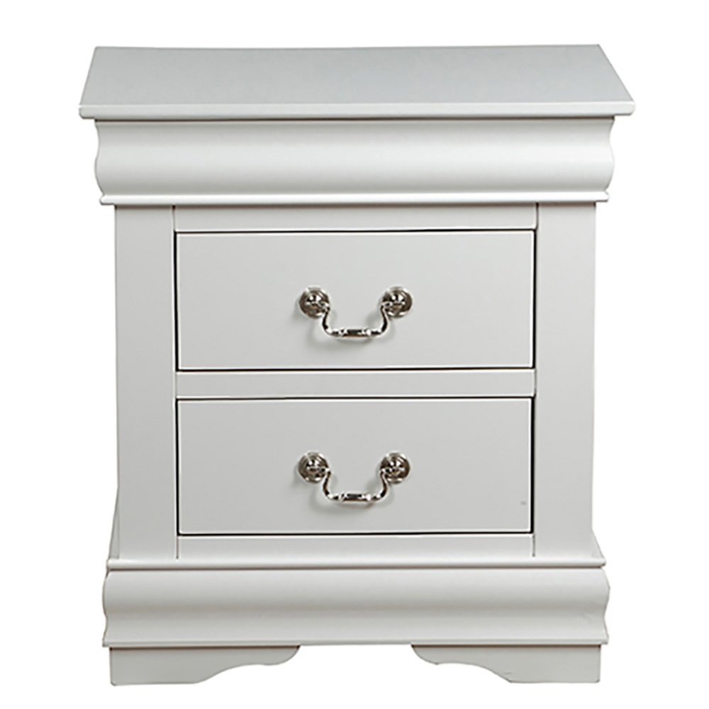This nightstand offers a timeless and classic design, perfect for traditional bedroom aesthetics, with two drawers providing ample storage space for essentials. Accented with brushed nickel handles that add modern elegance, its compact size makes it ideal for smaller bedrooms or as a complementary piece in the Louis Philippe Collection.