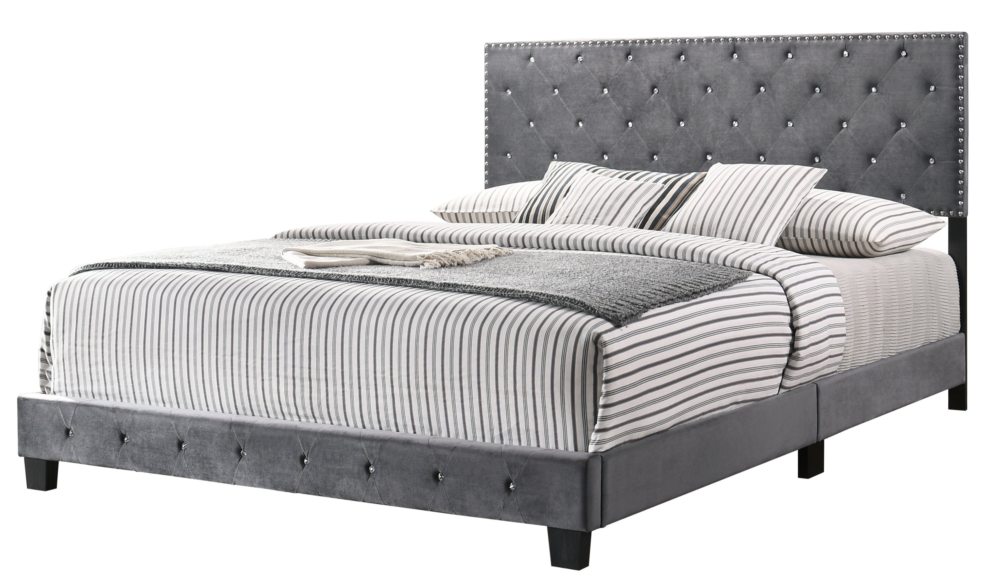 Upholstered Bed features a Faux Crystal Jeweled Tufted Velvet Cover