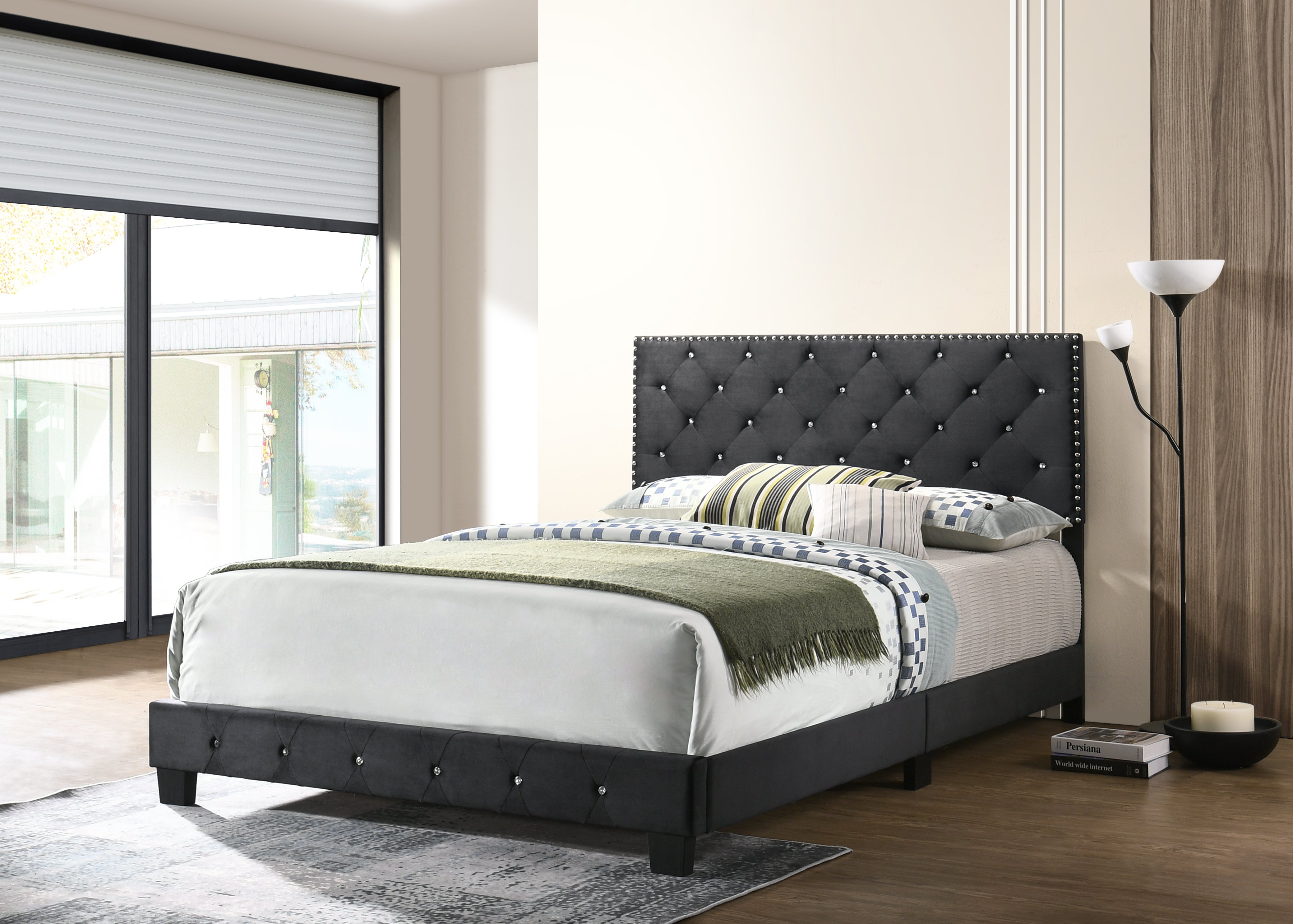 Upholstered Bed features a Faux Crystal Jeweled Tufted Velvet Cover