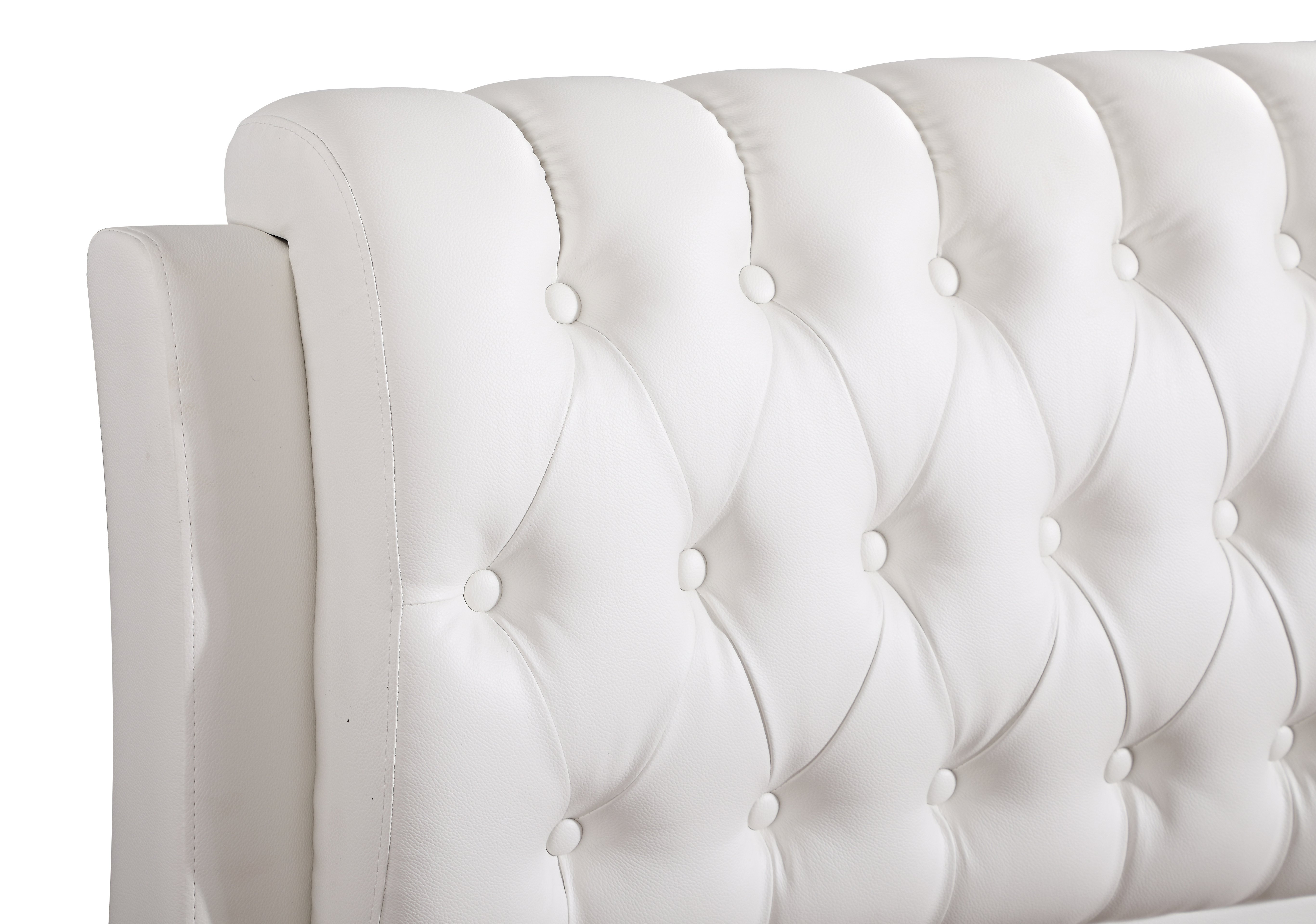 This Upholstered Bed features a Tufted High Grade Polyurethane Cover