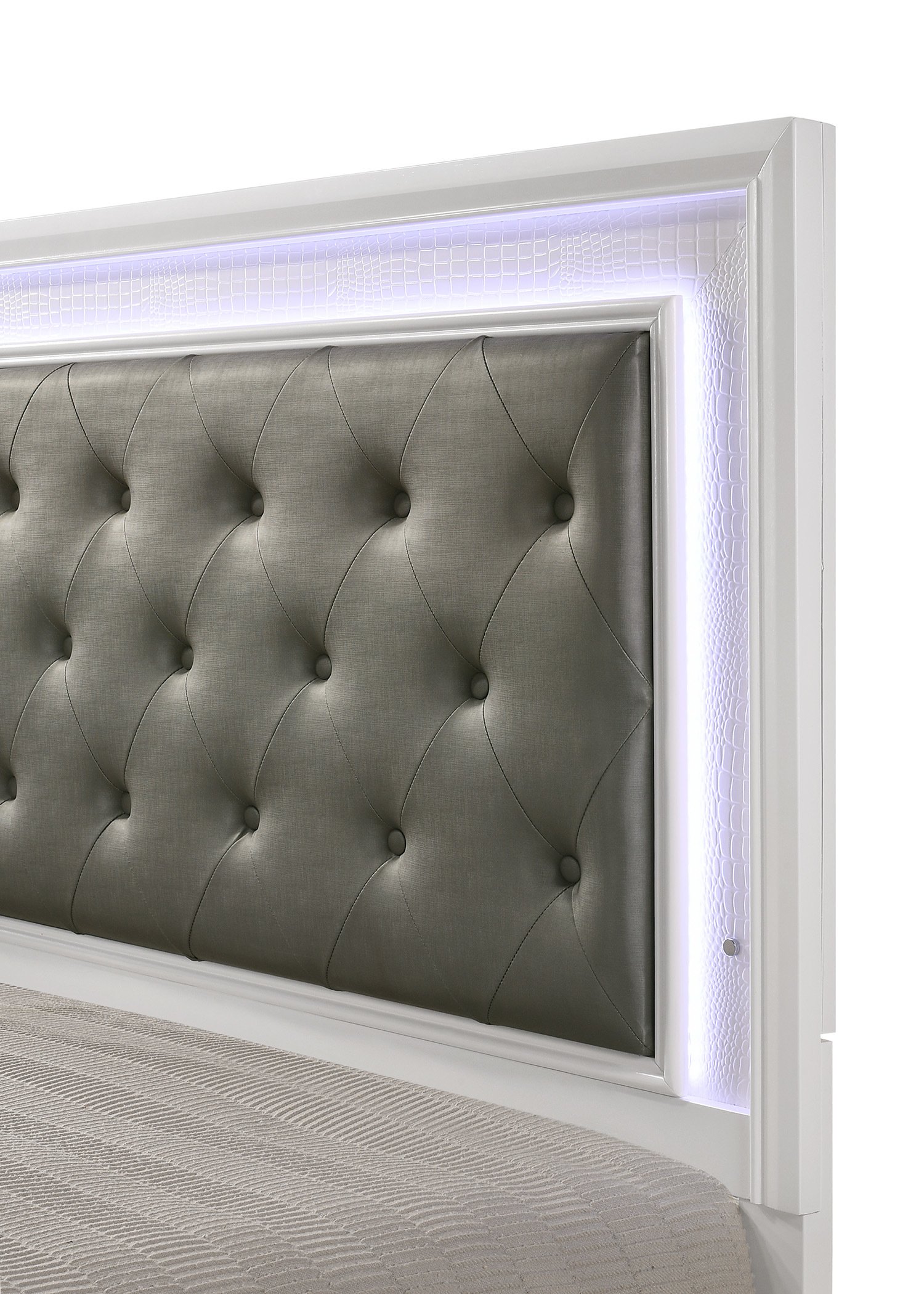 Product Dimensions: Queen HB : 63.4" X 1.5" X 59.5"H Queen FB : 63" X 1.5" X 17.3"H Queen Rail : 81.1" X 0.7" X 5.5"H Product Description: This stunning bed will be a perfect centerpiece in your glamorous bedroom. Featuring a white crocodile skin finish, this bed is glam to the max. Relax against the upholstered headboard with diamond tufting illuminated by a built-in LED backlight. You can pair this bed with the nightstand with a night light from this collection for a distinctive bedroom set. Listing Include:1pc Queen Size Bed Only.