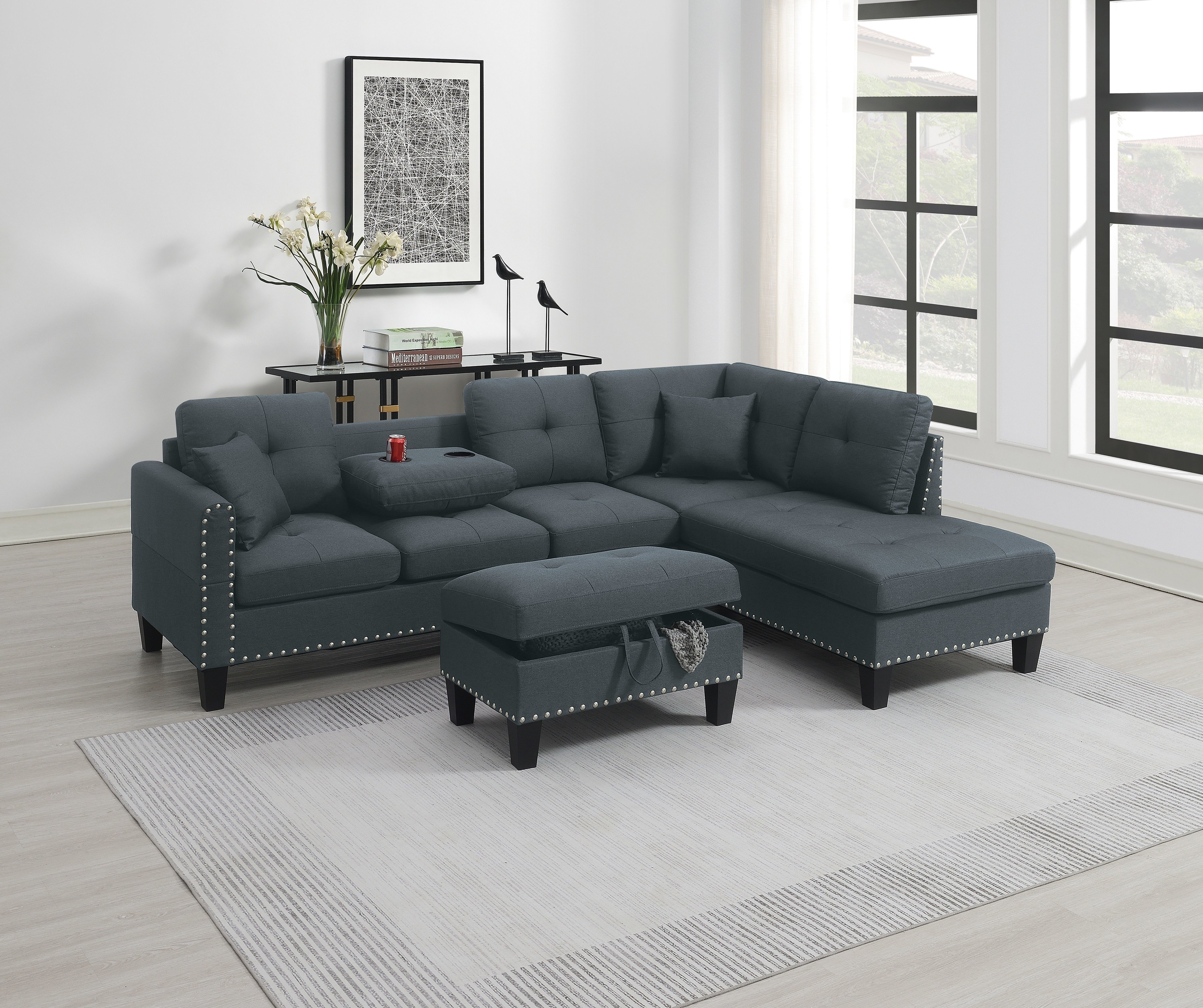 Description :-This sectional is everything you'd ever want in your living space; it comes in a neutral tone that matches almost any style or color scheme. With subtle tufting back cushions, medium-firm seat cushions, and nail head trim add the traditional feel we love.Product Dimensions :-LAF Sofa :- 67" x 30" x 34"HRAF Chaise :- 71" x 31" x 34"HStorage Ottoman :- 29" x 20" x 18"HOverall Sectional : 101" x 67" x 34"HListing Includes :- 3pcs Sectional Sofa Set (LAF Sofa, RAF Chaise And Storage Ottoman) Only.Assembly : Simple Assembly Required.Features:-•Modern / Contemporary•Charcoal Color•Linen-Like Fabric•RAF Chaise, LAF Sofa And Storage Ottoman•Pillows Included•Cup Holder•Nailhead Trim•Tufted Cushion Couch