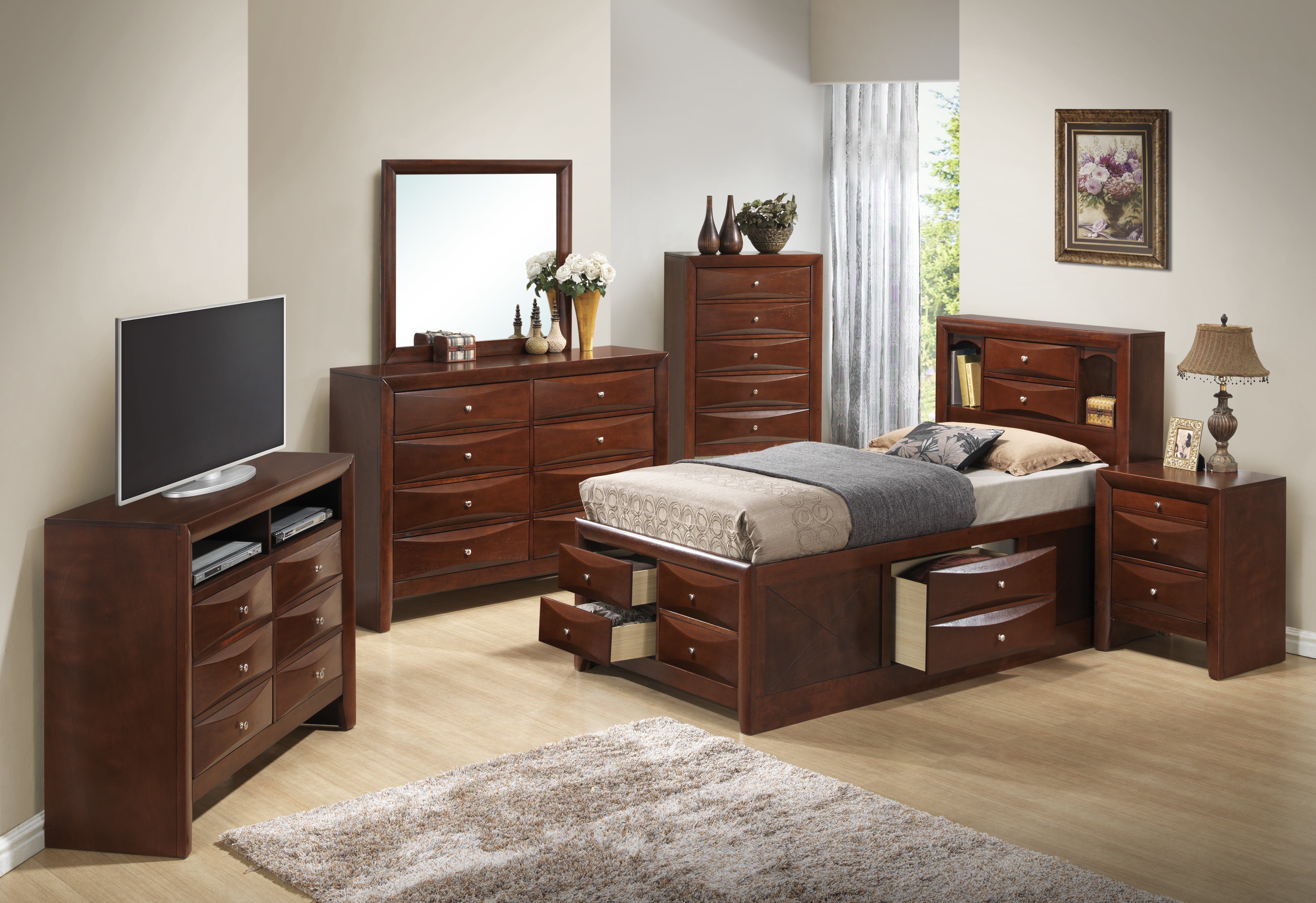Molded Resin Beveled Drawer Fronts and Real Wood Veneers are used on this Modern Top Selling Bedroom
