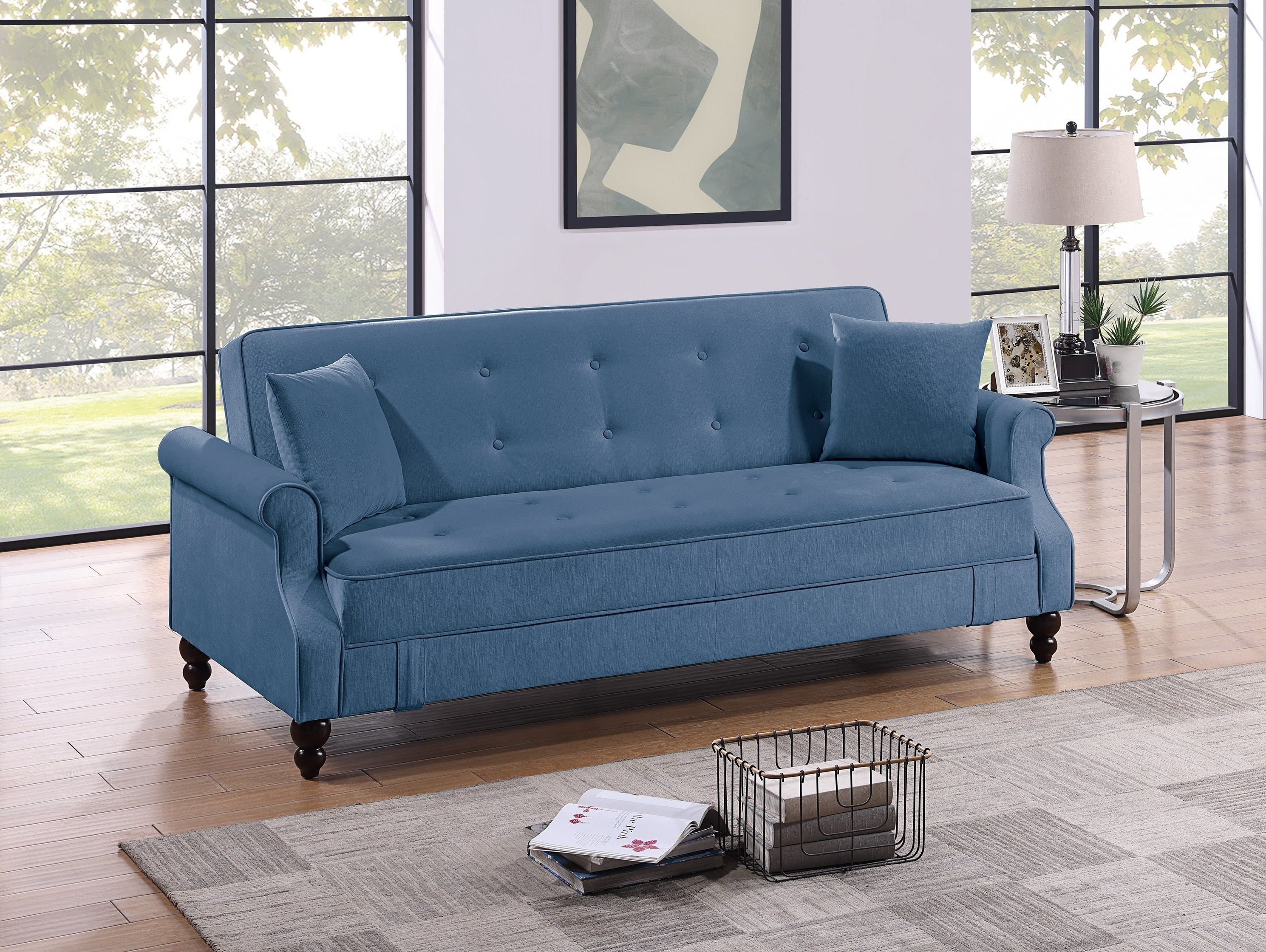 Whether you're entertaining guests or enjoying a cozy night in, the Adjustable Sofa effortlessly adapts to your lifestyle. With just a pull of the back it seamlessly transforms from a chic sofa to a comfortable bed. The button-tufted back and seat cushions not only provide an elegant touch but also ensure plush comfort for your lounging or sleeping needs. The attention to detail is evident in the modern rolled slope panel design of the arms, and the round gourd shaped legs not only provide sturdy support but also contribute to the sofa's overall aesthetic appeal. Say goodbye to clutter as you stow away your favorite books, throw pillows, or blankets, with convenient under-seat storage, keeping your space organized and inviting. And to complete the picture of luxury, we've included 2 accent pillows that complement the sofa's design, adding a touch of personality to your living room.