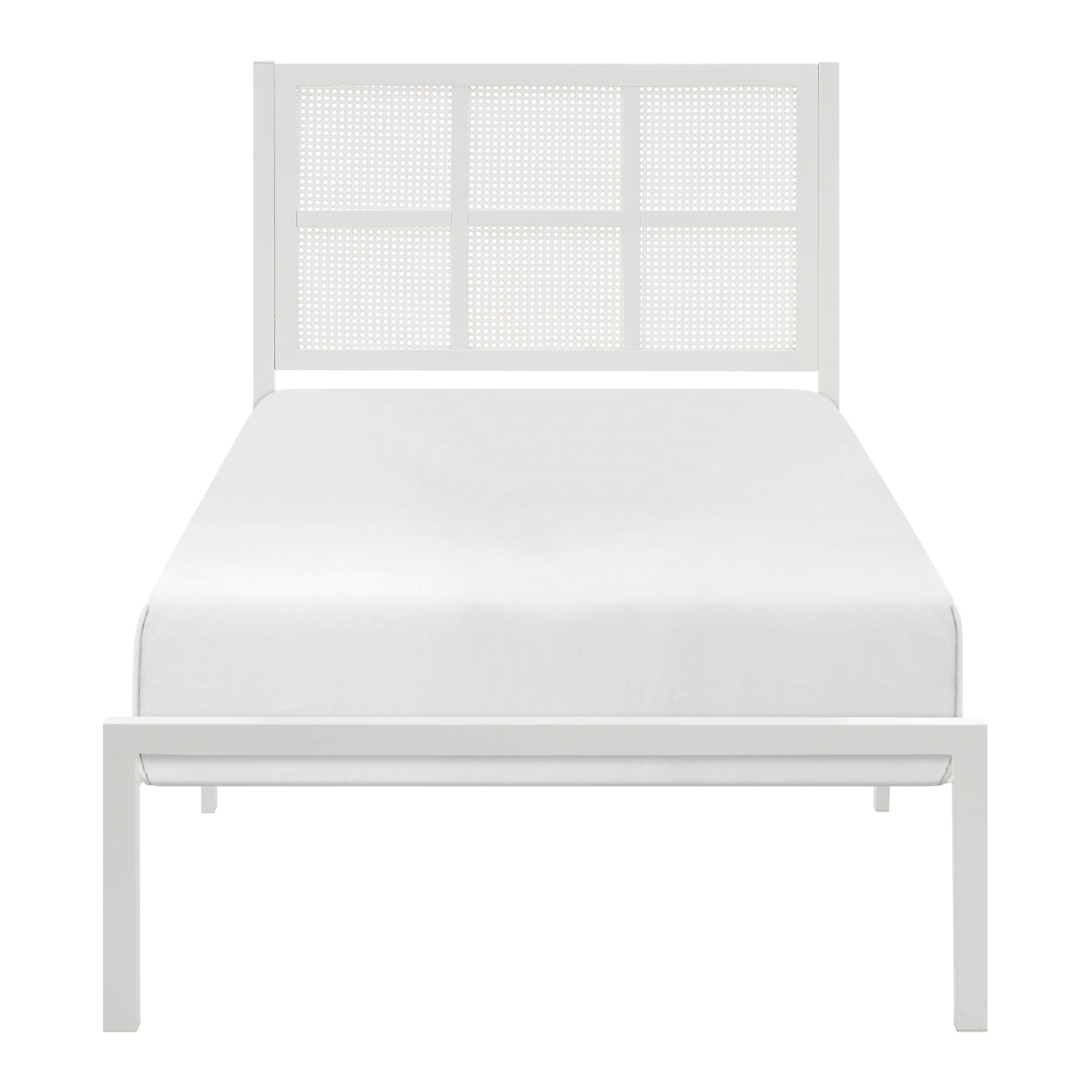Lending a casual coastal vibe to your bedroom is the Sanibel Collection. The white finished metal twin bed features a framed faux cane panel headboard. Clean lines comprise the design of the bed, with the faux cane providing textural dimension to the headboard. The platform metal bed doesn't require a box spring.PRODUCT DIMENSIONS: Overall Dimension: 41.5" x 77.5" x 44"HHeadboard width: 41.5"Headboard height: 44"Footboard width: 41.5"Footboard height: 15.5"Rail to floor: 11"Listing Includes: One Twin Size Platform Bed Only.Mattress: Not included.Simple Assembly Require.