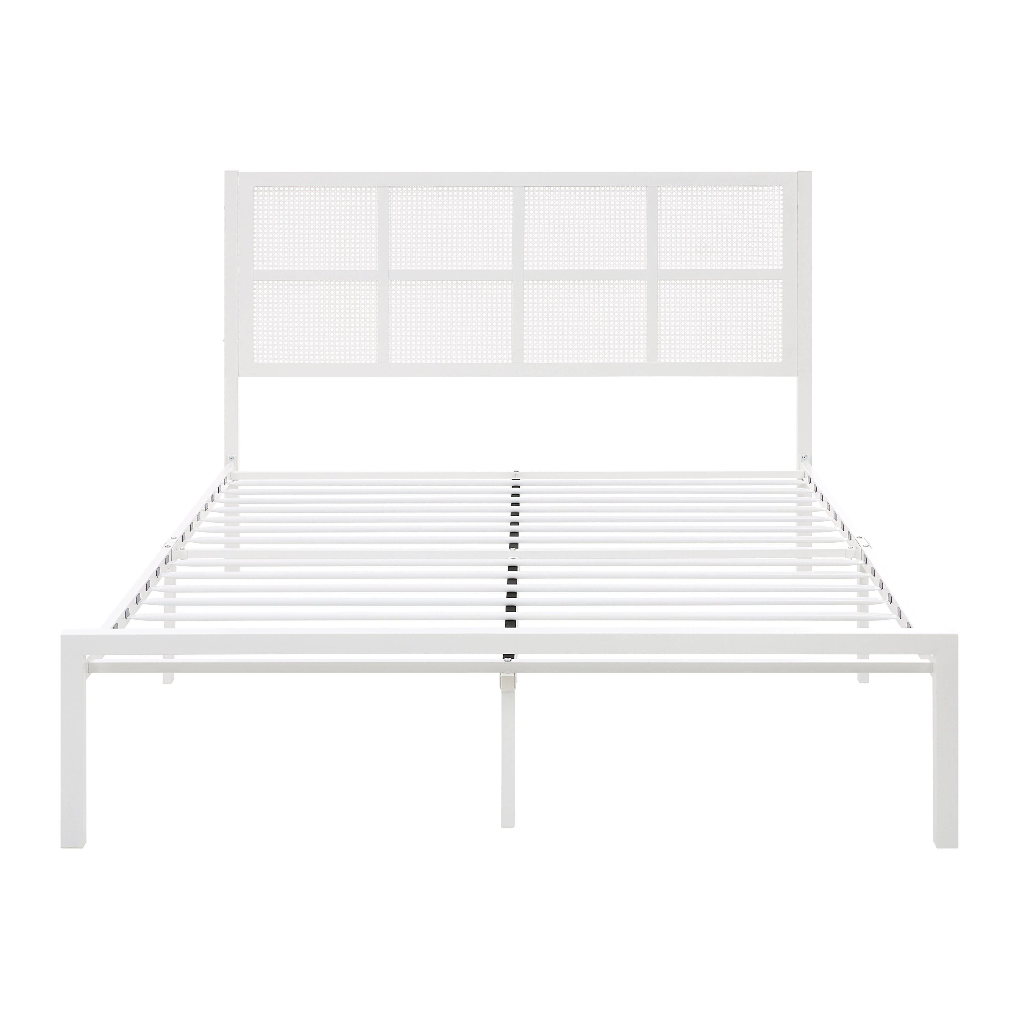 Lending a casual coastal vibe to your bedroom is the Sanibel Collection. The white finished metal queen bed features a framed faux cane panel headboard. Clean lines comprise the design of the bed, with the faux cane providing textural dimension to the headboard. The platform metal bed doesn't require a box spring.PRODUCT DIMENSIONS: Overall Dimension: 62.5" x 83" x 44"HHeadboard width: 62.5"Headboard height: 44"Footboard width: 62.5"Footboard height: 15.5"Rail to floor: 11"Listing Includes: One Queen Size Platform Bed Only.Mattress: Not included.Simple Assembly Require.