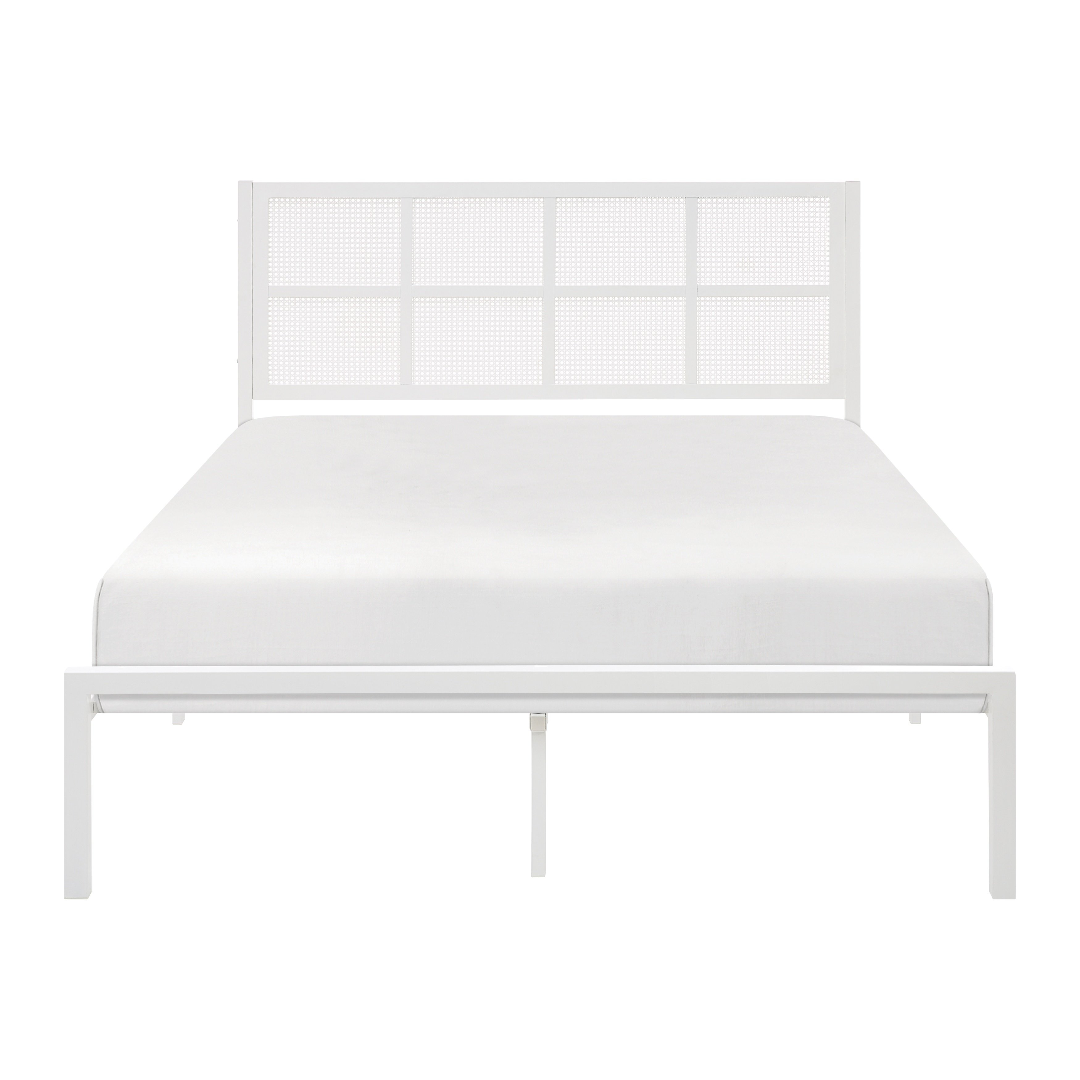 Lending a casual coastal vibe to your bedroom is the Sanibel Collection. The white finished metal Eastern King bed features a framed faux cane panel headboard. Clean lines comprise the design of the bed, with the faux cane providing textural dimension to the headboard. The platform metal bed doesn't require a box spring.PRODUCT DIMENSIONS: Overall Dimension: 78.5" x 83" x 44"HHeadboard width: 78.5"Headboard height: 44"Footboard width: 78.5"Footboard height: 15.5"Rail to floor: 11"Listing Includes: One Eastern King Size Platform Bed Only.Mattress: Not included.Simple Assembly Require.