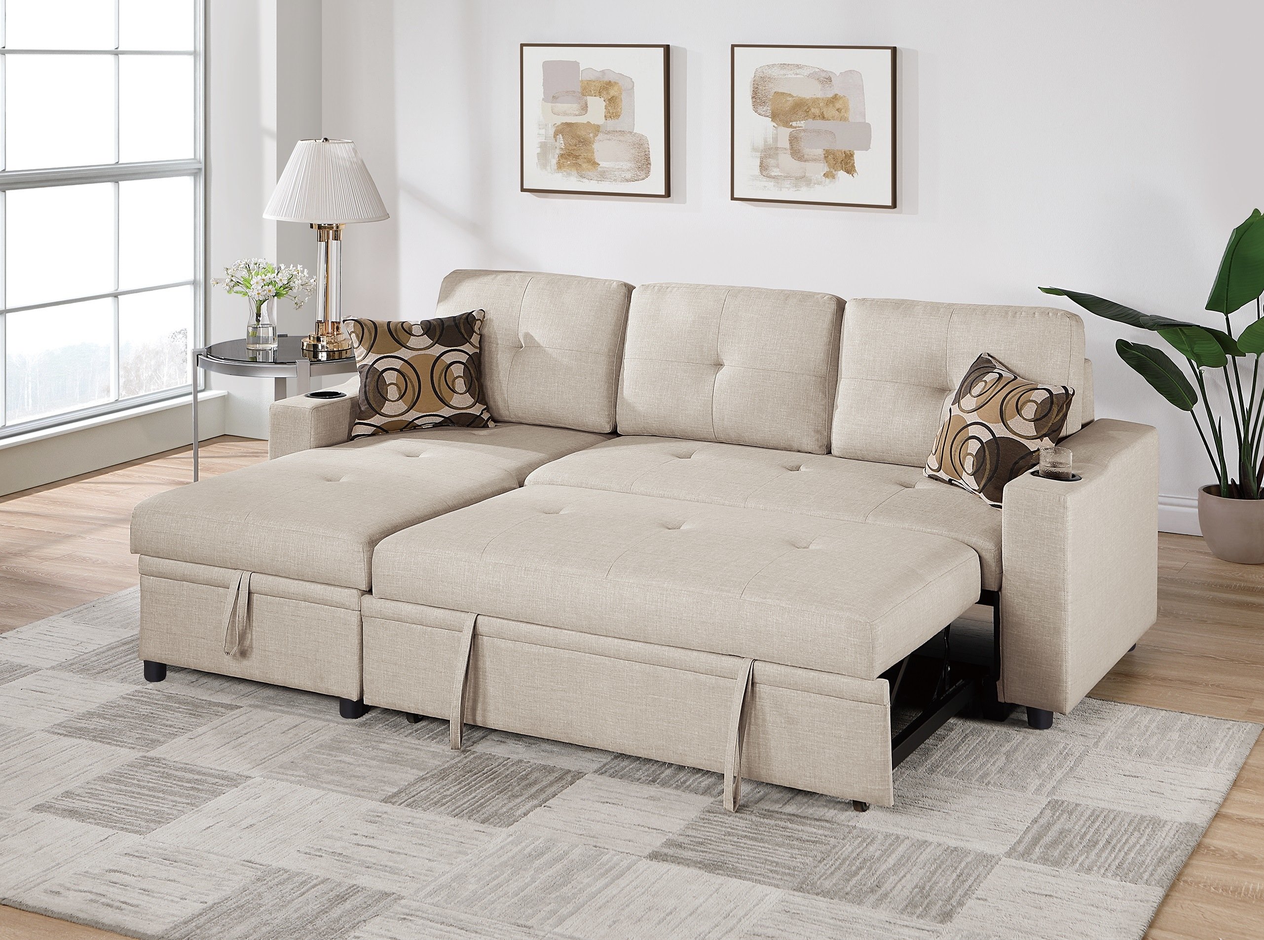 Beige Dorris Fabric Convertible Sectional Sofa Pull out Bed Couch Storage Chaise Cup Holders 2pc Sectional Living Room