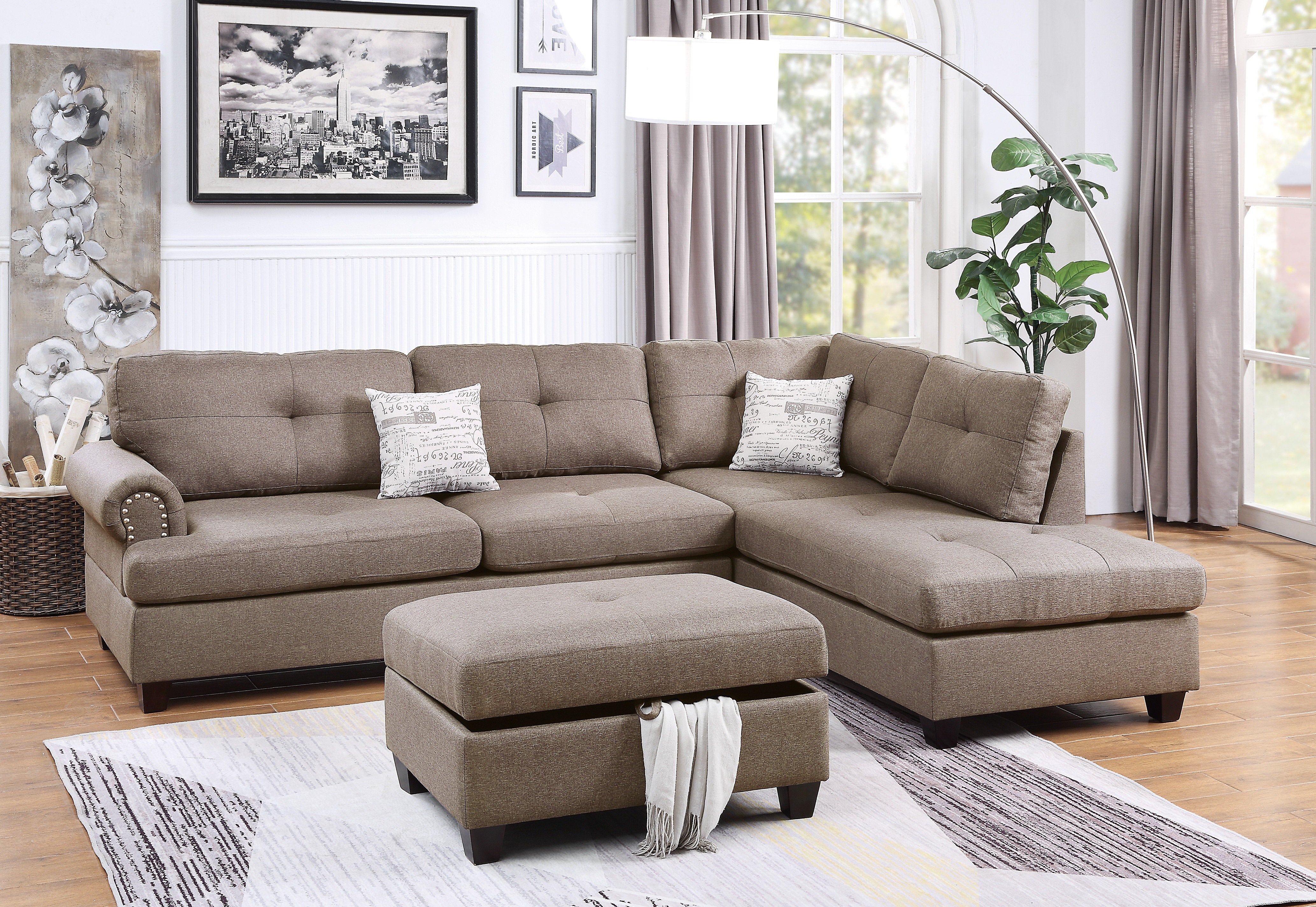Description :- Achieve the perfect living room design with this 3-piece reversible sectional. Upholstered with simple stitching on the seat and back cushions, this unit works great with any contemporary designed living space. Other details include rolled armed with nickel-finished studding, an armless Reversible Chaise, Cocktail Storage Ottoman, and two accent pillows. Available in Blue Grey, Ash Black, and Mocha (Dorris Fabric).