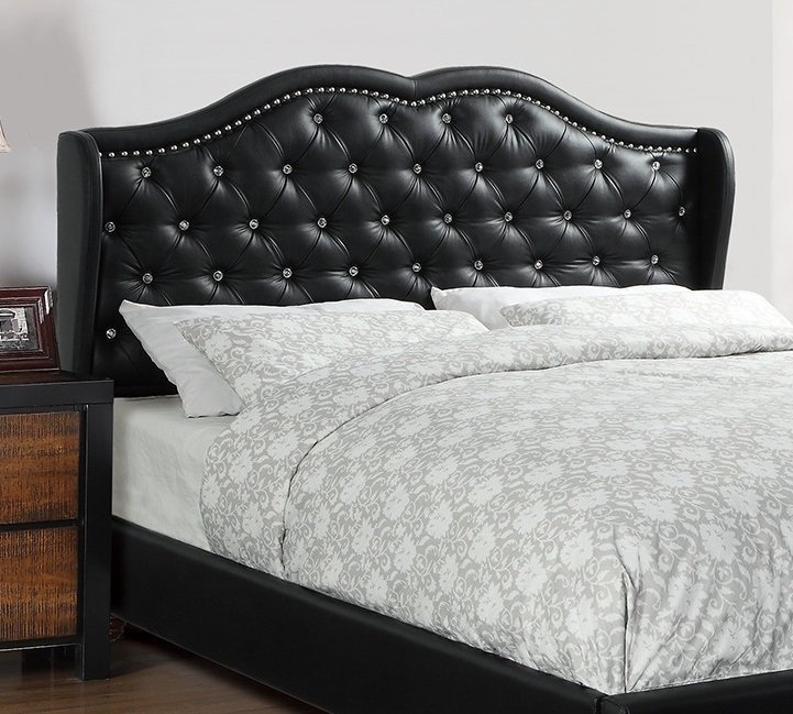 Rest assure that with this enchanting upholstered bedframe your living space will bring a magical experience. It's curveted headboard features button tufting and stud trim. No Box Spring Required. Available in burgundy, silver or black faux leather.