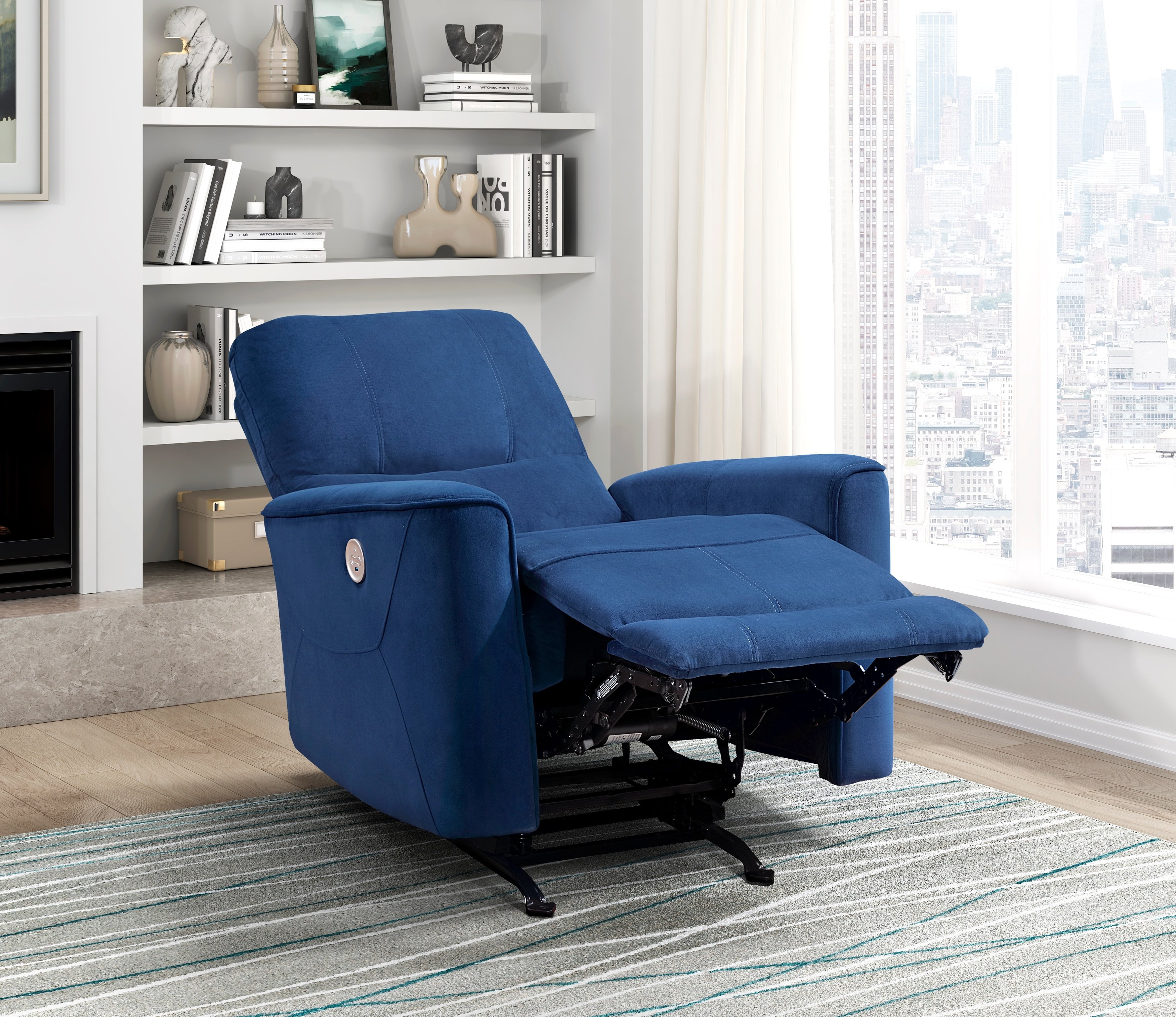 Whether utilized as a stand-alone chair or as an addition to your current seating arrangement, the Artem Collection's modern profile will provide a functional and comfortable seating option for your home. With the push of a button, you are taken from seated to laying down, your position adjusted to your personal liking while the gentle rocking motion of the chair furthers your comfort. The chair is covered in navy velvet fabric upholstery for a bold complement to your space.PRODUCT DIMENSIONS: Overall Dimension: 35" x 37.5" x 39.5"HSeat Width: 21"Seat Depth: 22"Seat Height: 19.5"Arm height: 24"Fully reclined length: 62"Fully reclined height: 31.5"Required back clearance to recline: 13"Doorway width: 24"Listing Includes: One Reclining Chair Only.Simple Assembly Require.