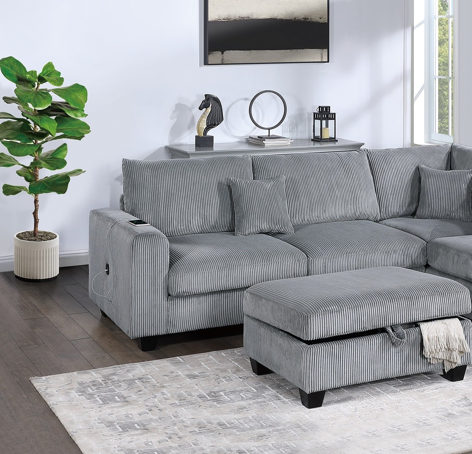This 3-Piece Sectional Set is designed to redefine comfort and style in your living space. Experience convenience at your fingertips with the Left Arm Facing (LAF) Sofa, featuring a built-in USB port for easy charging of your devices. Sink into relaxation with the Right Arm Facing (RAF) Chaise, offering ample space to stretch out and unwind after a long day. Making it the perfect spot for lounging, reading, or simply enjoying your favorite movie. Maximize your living room storage with the included Storage Ottoman, perfect for stashing away blankets, magazines, or remote controls, it seamlessly blends style with functionality. Crafted with corduroy material soft to the touch and adds a touch of sophistication to your living space. Complete with two throw pillows, this 3-Piece Sectional Set is the epitome of modern elegance and comfort.