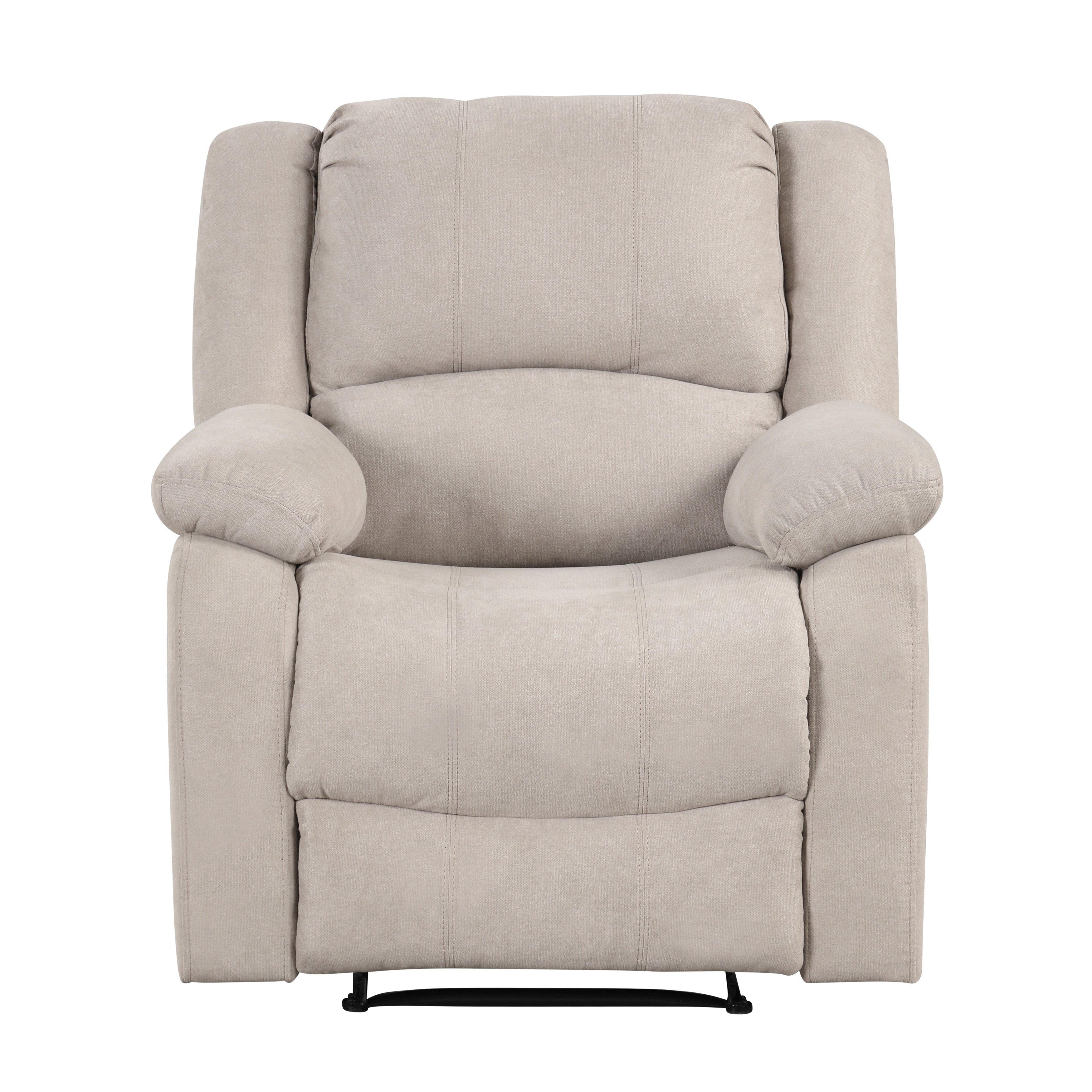 A solid pairing to your transitional living room, the Fairview Collection's decorative versatility, and plush seating creating a reclining chair that is a complement to your lifestyle. Oatmeal-hued textured fabric upholstery covers the chair, the neutral hue lending unobtrusive style to your space. The manual motion mechanism of the piece is engaged with a pull of the side-mounted tab, transitioning you from seated to reclined. The contoured seat structure is amply paired with pillowtop arms maximizing your comfort.PRODUCT DIMENSIONS: Overall Dimension: 35" x 38" x 40.5"HSeat Width: 19"Seat Depth: 21.5"Seat Height: 19"Arm height: 25.5"Fully reclined length: 63"Fully reclined height: 32"Doorway width: 25.5"Required back clearance to recline: 2.5"Listing Includes: One Reclining Chair Only.Simple Assembly Require.