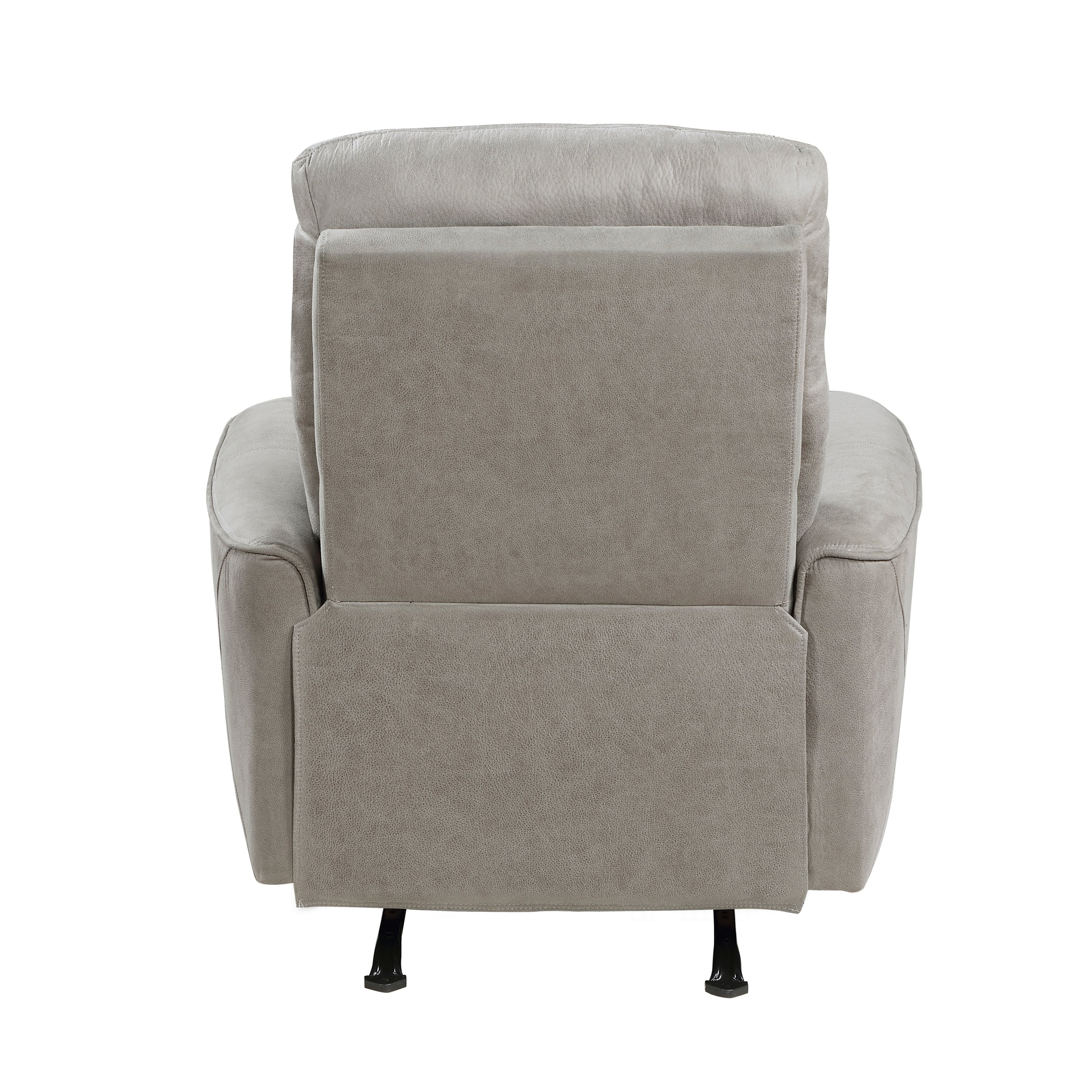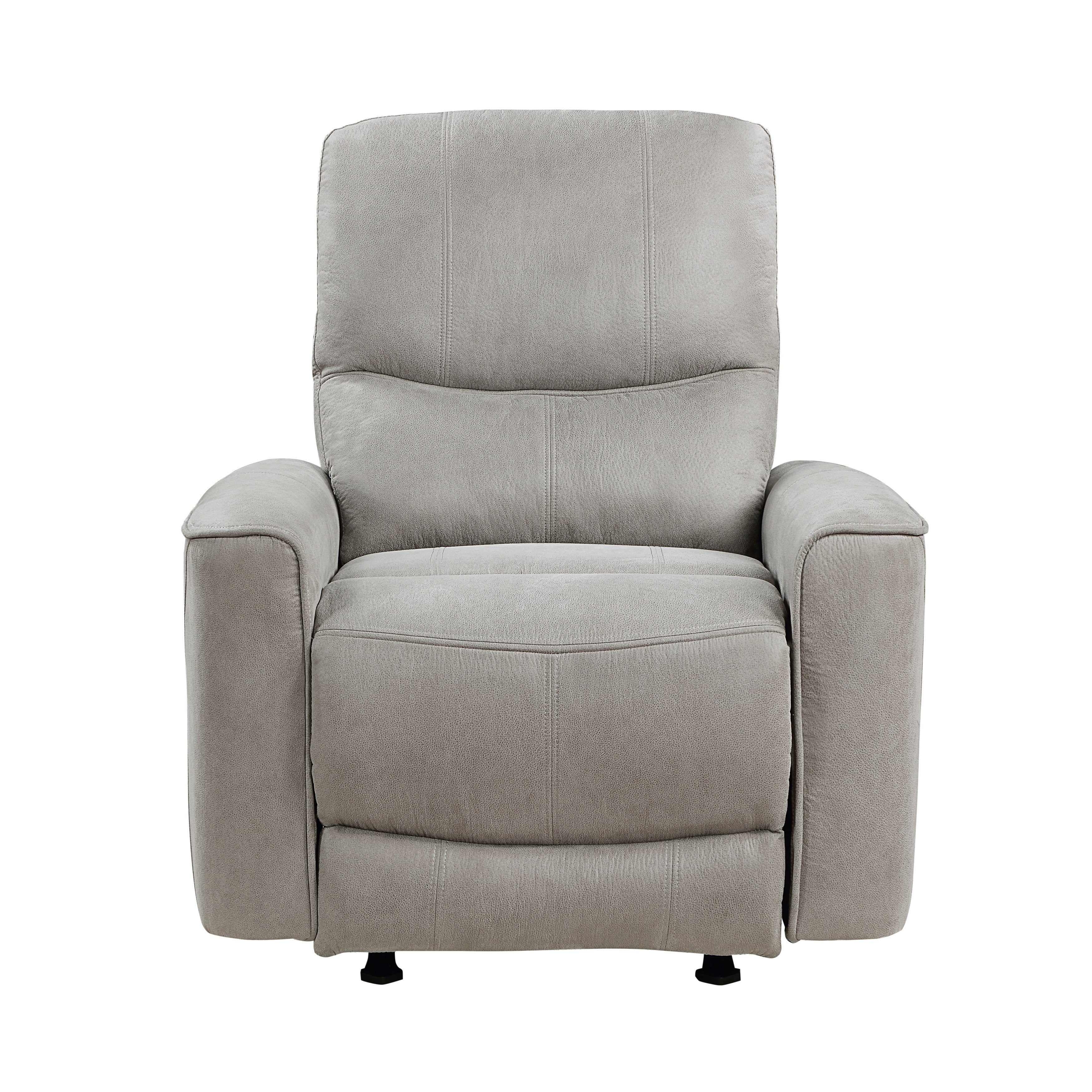 Whether accompanying your existing living room seating or used as a stand-alone chair, the Ouray Collection's modern-transitional style makes for a perfect complement for your home's seating needs. The rocker recliner features a gray polished microfiber cover and manually engaged motion mechanism. Track style arms, and contoured seats further lend to the classic style.PRODUCT DIMENSIONS: Overall Dimension: 35.5" x 38.5" x 39.5"HSeat Width: 22"Seat Depth: 23"Seat Height: 20"Arm height: 24"Fully reclined length: 62.5"Fully reclined height: 30"Doorway width: 24"Required back clearance to recline: 11.5"Listing Includes: One Reclining Chair Only.Simple Assembly Require.