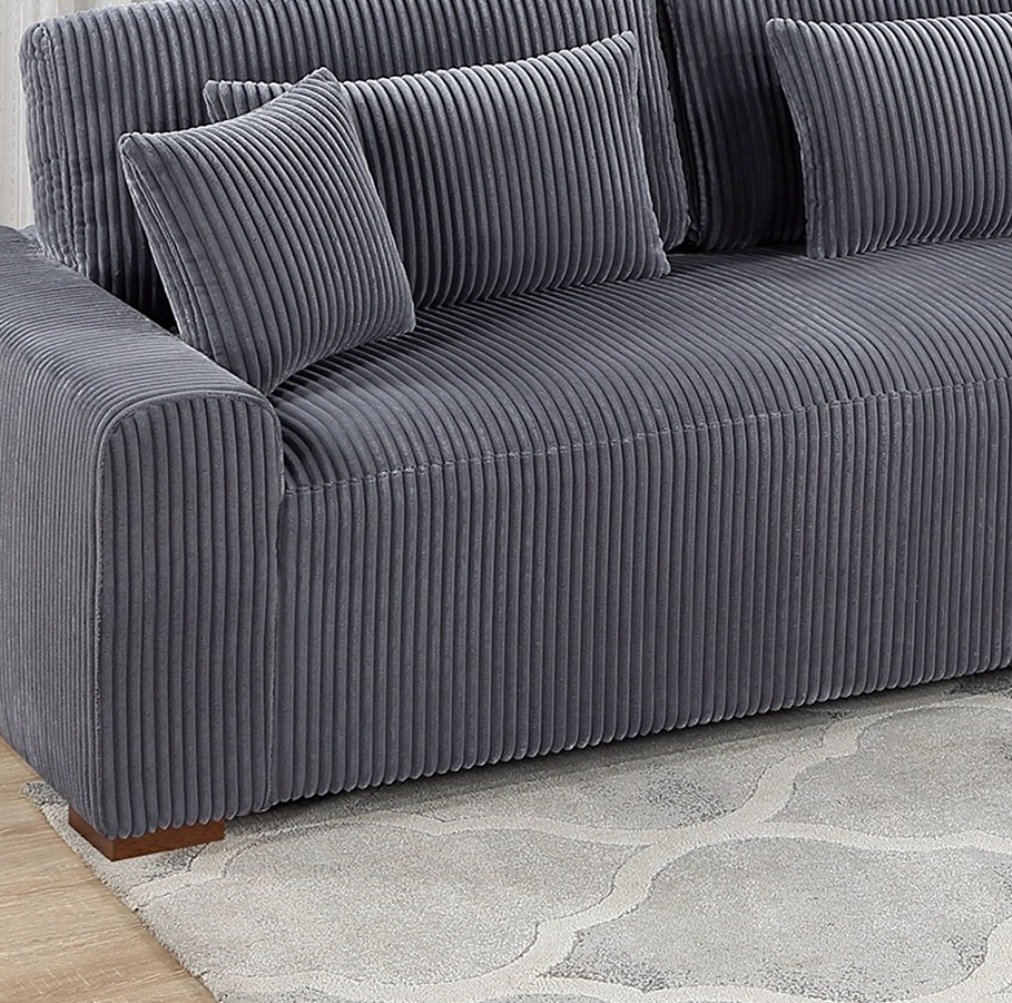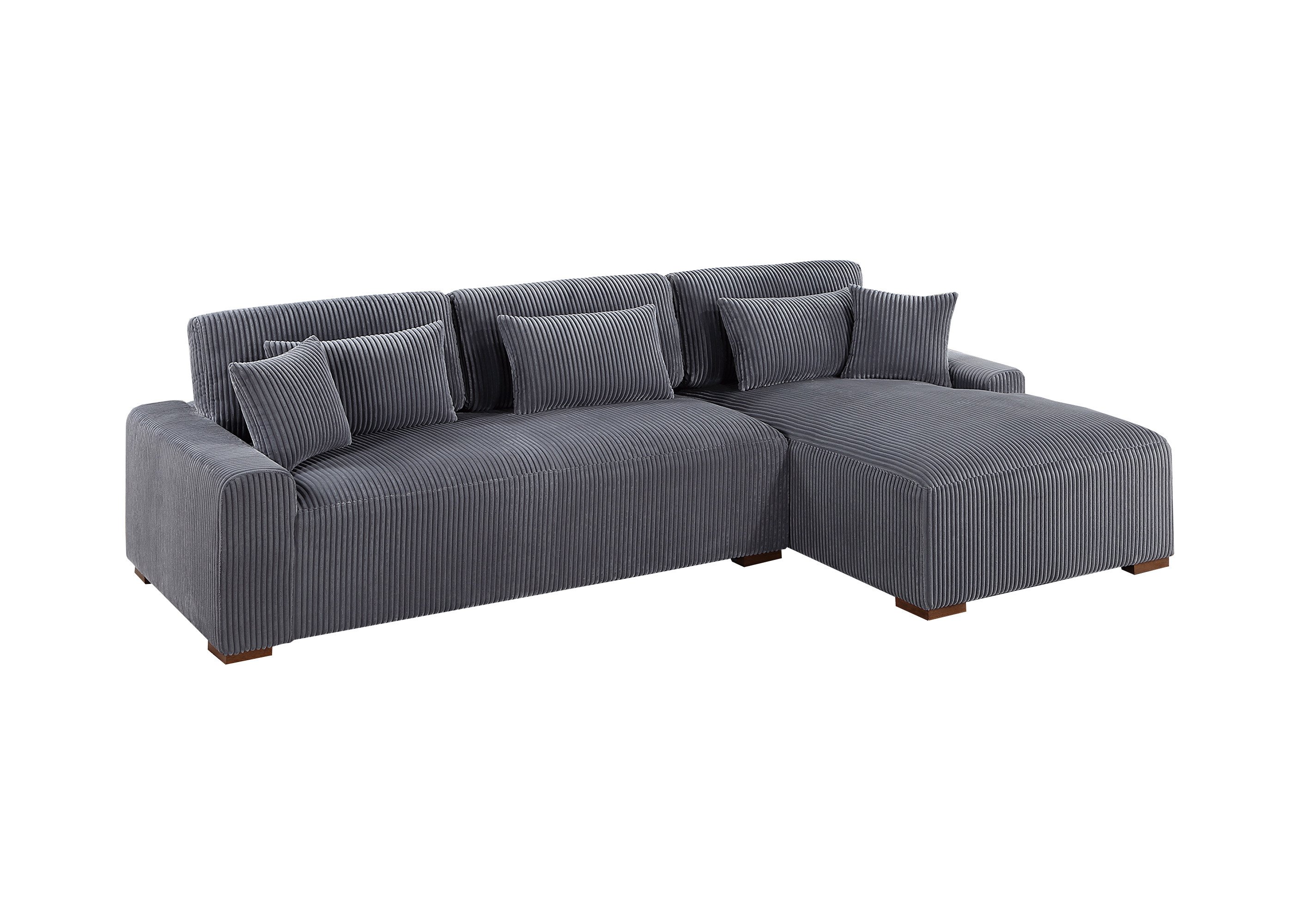 Whether you're hosting a movie night with friends or simply unwinding after a long day, this 2-Piece Sectional Set offers the perfect combination of style and comfort. The plush corduroy fabric is luxuriously soft and inviting, perfect for creating a warm and cozy atmosphere in your living room. Featuring clean lines and a modern silhouette, perfect for complementing any living space. The squared arms add a touch of sophistication, while the low-profile legs create a sleek, contemporary look. The attached seat cushion streamlines the design and provides a smooth seating surface. This set comes complete with five accent pillows mix and match the pillows to create a look that reflects your unique taste.