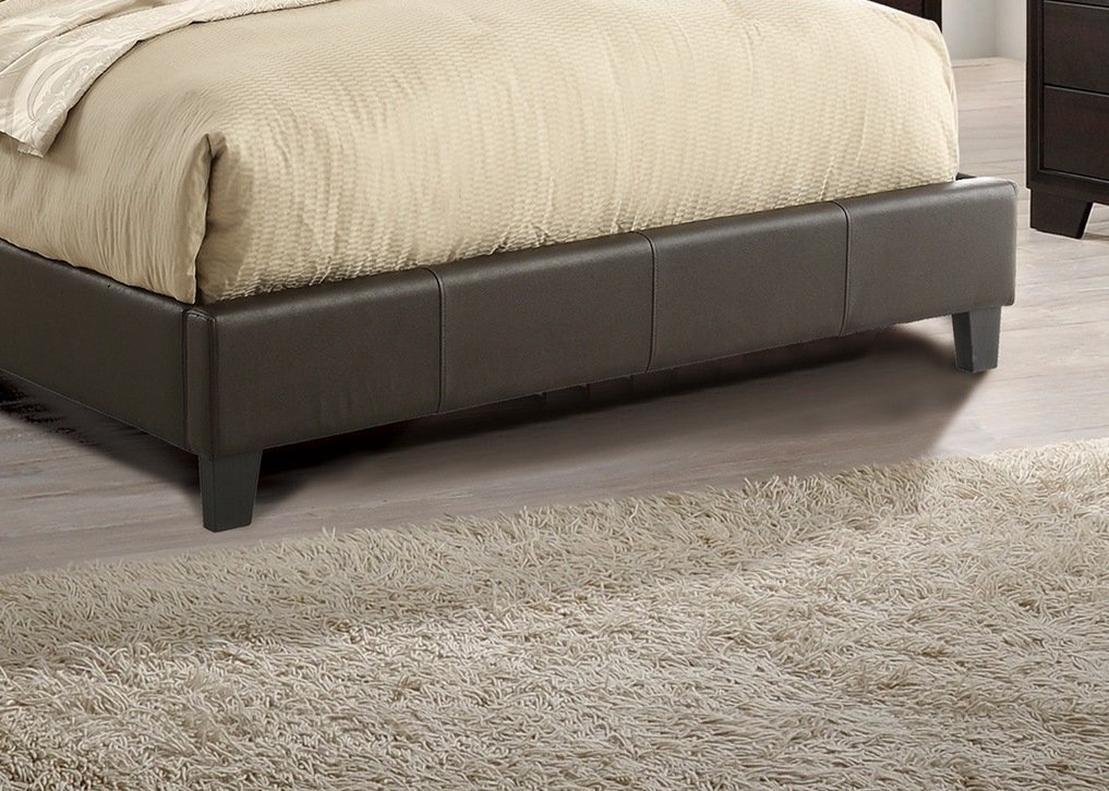 Product Features:- •Contemporary •Brown Color •Upholstered Headboard •Faux Leather •Pine, FR fiber batting •Particle Board •Classic, Modern Elegance •Foam / plastic leg •Box Spring Not required.