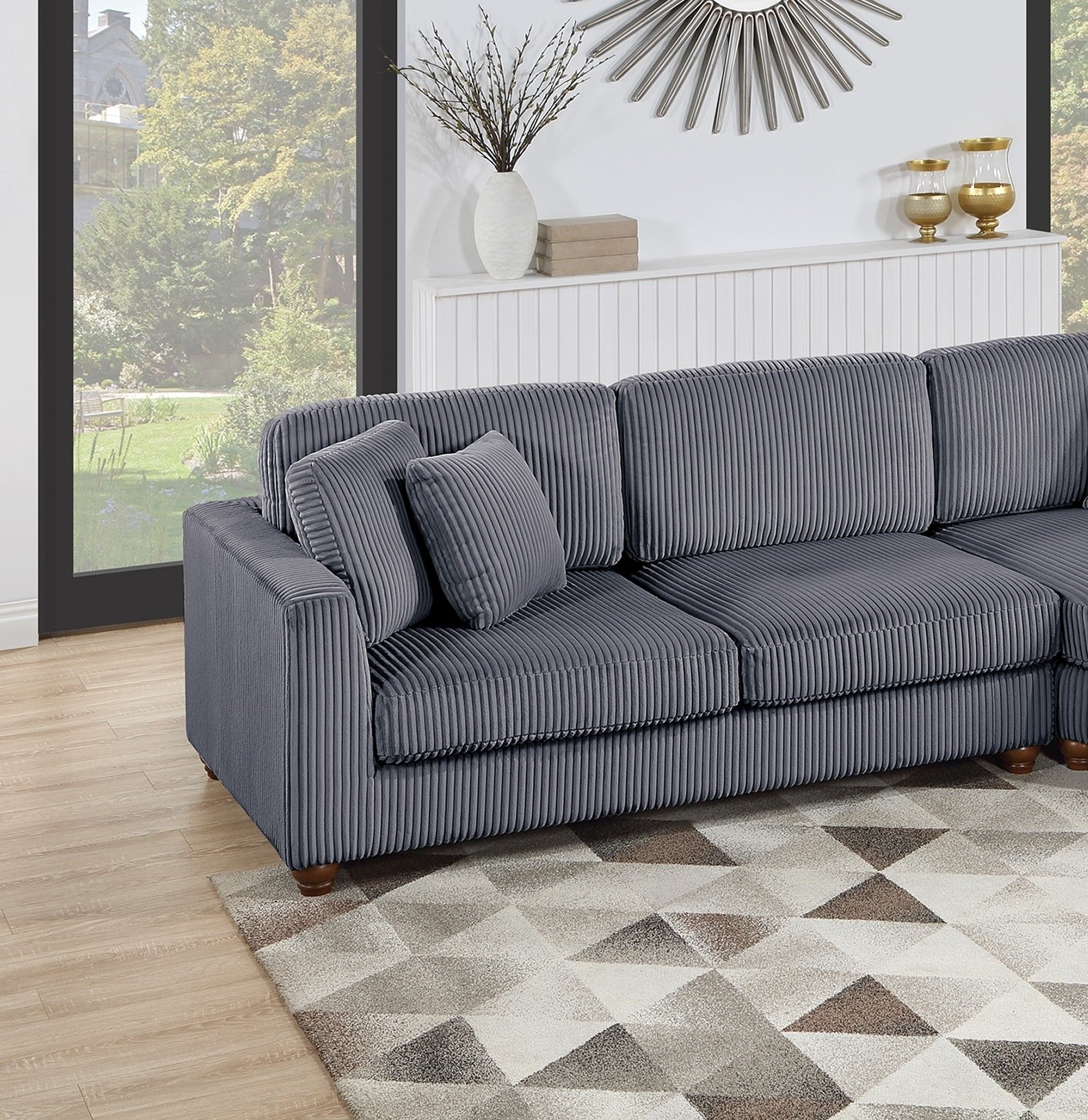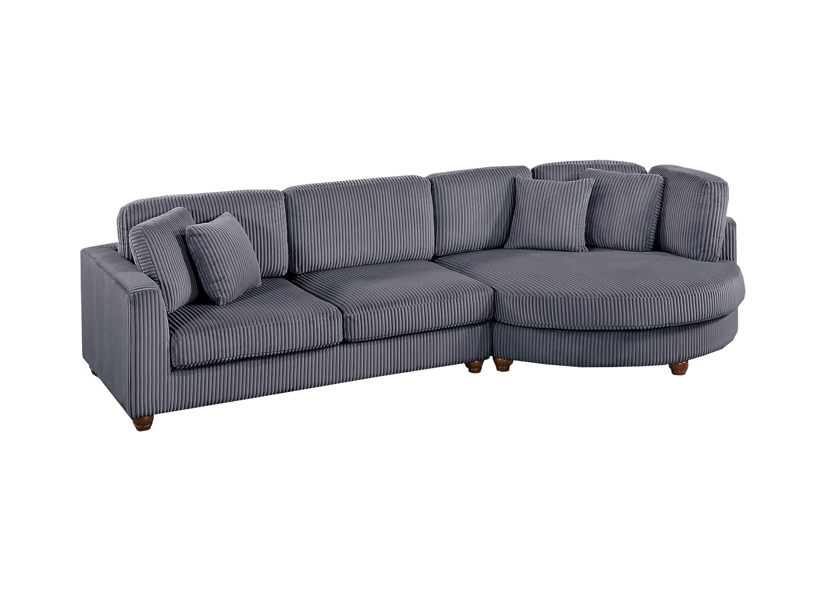 Transform your home into a sanctuary of comfort and style with this 2-Piece Sectional Set. Featuring a Right Arm Facing (RAF) Chaise and a Left Arm Facing (LAF) Sofa, perfectly complemented by four plush accent pillows. The RAF Chaise's unique round shape adds a modern twist to your décor, while the LAF Sofa provides versatile seating for all your gatherings. Supported by low-profile round legs, this sectional set exudes sophistication while ensuring comfortability. Sink into the sumptuous corduroy material, offering a soft touch that invites relaxation after a long day. Whether you're curling up with a good book or hosting guests for movie night, this sectional provides the perfect finishing touch to your living space.