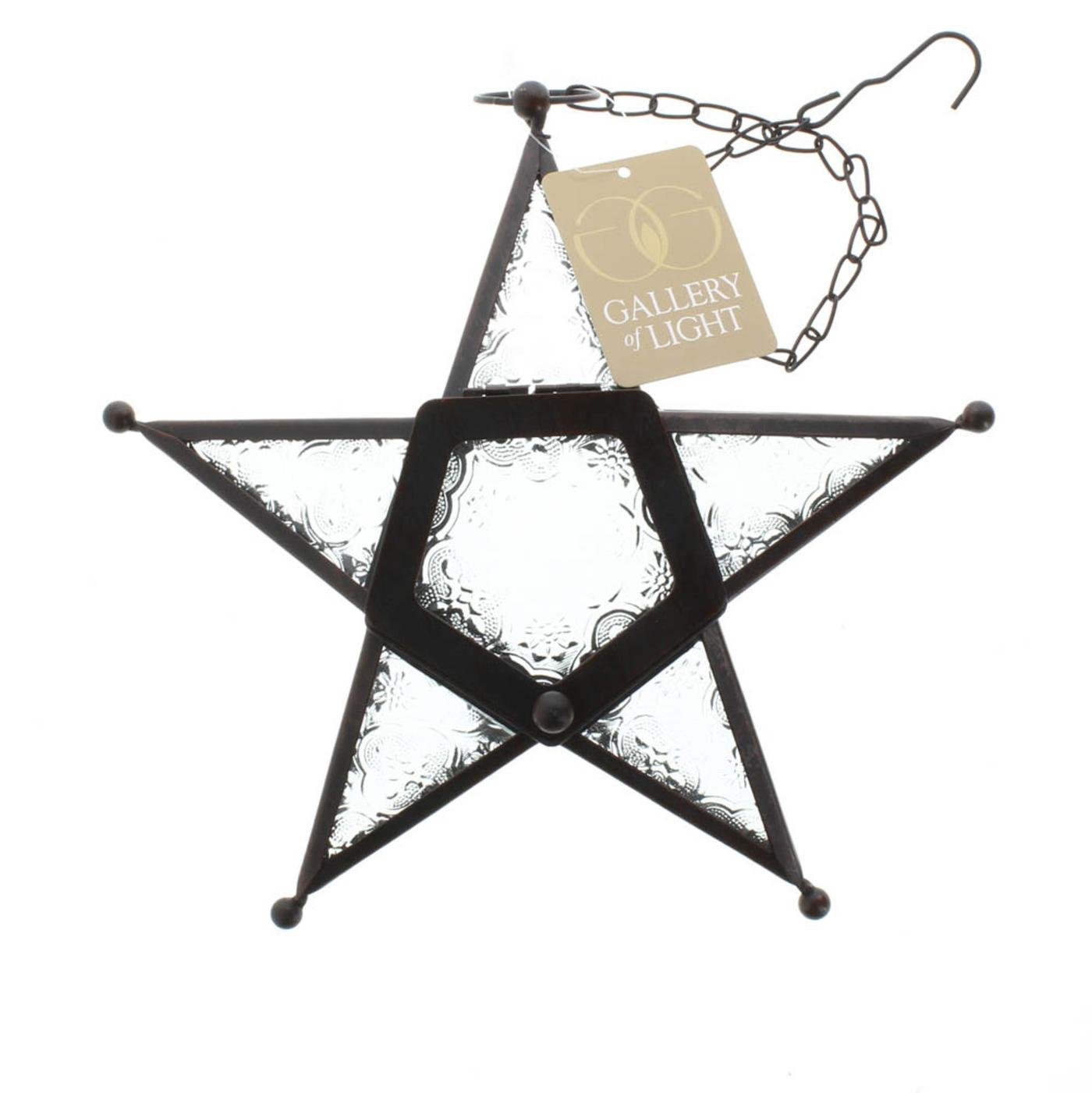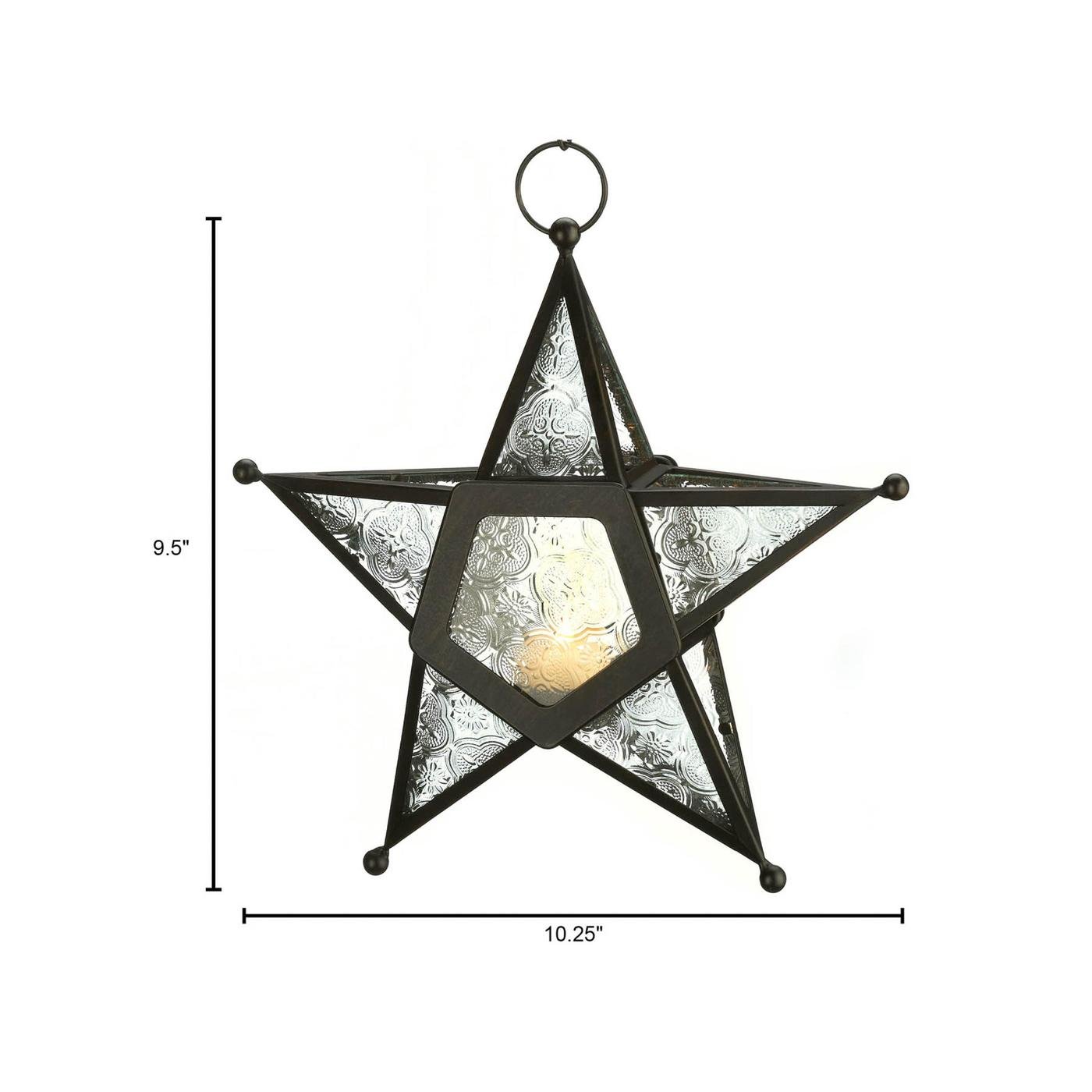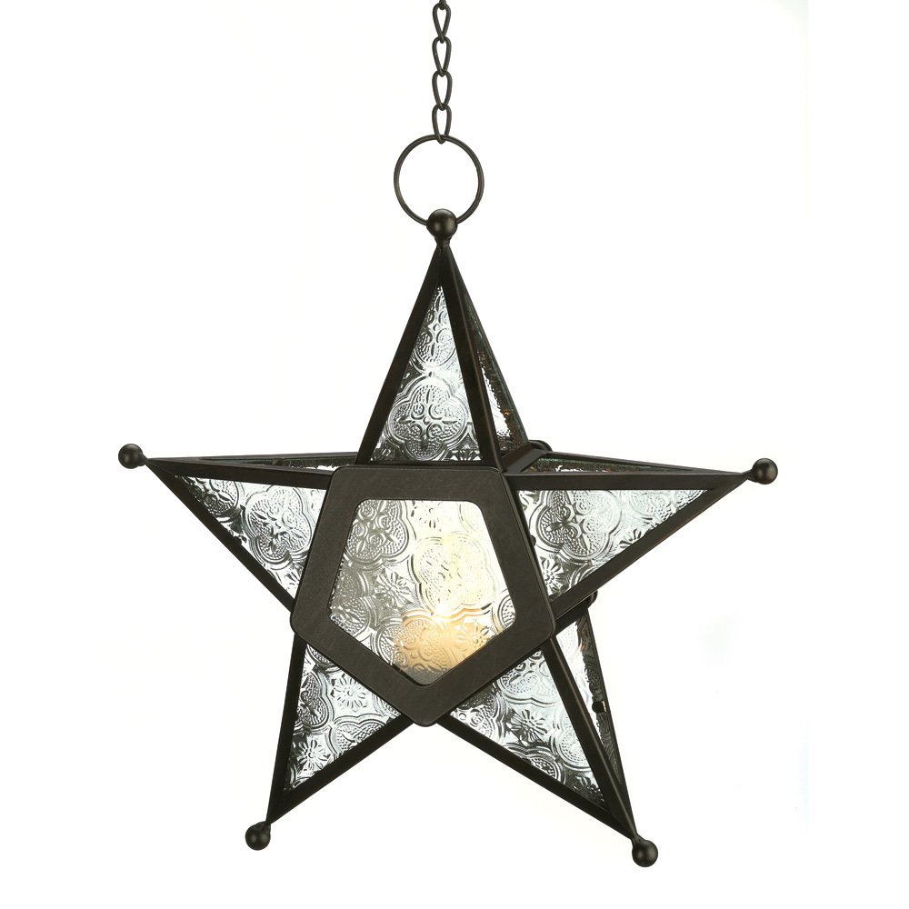 Add a candle to this five-pointed star to fill the night with celestial light! Artistic hanging lantern features ornate panels of clearest glass set into a wrought-iron frame.