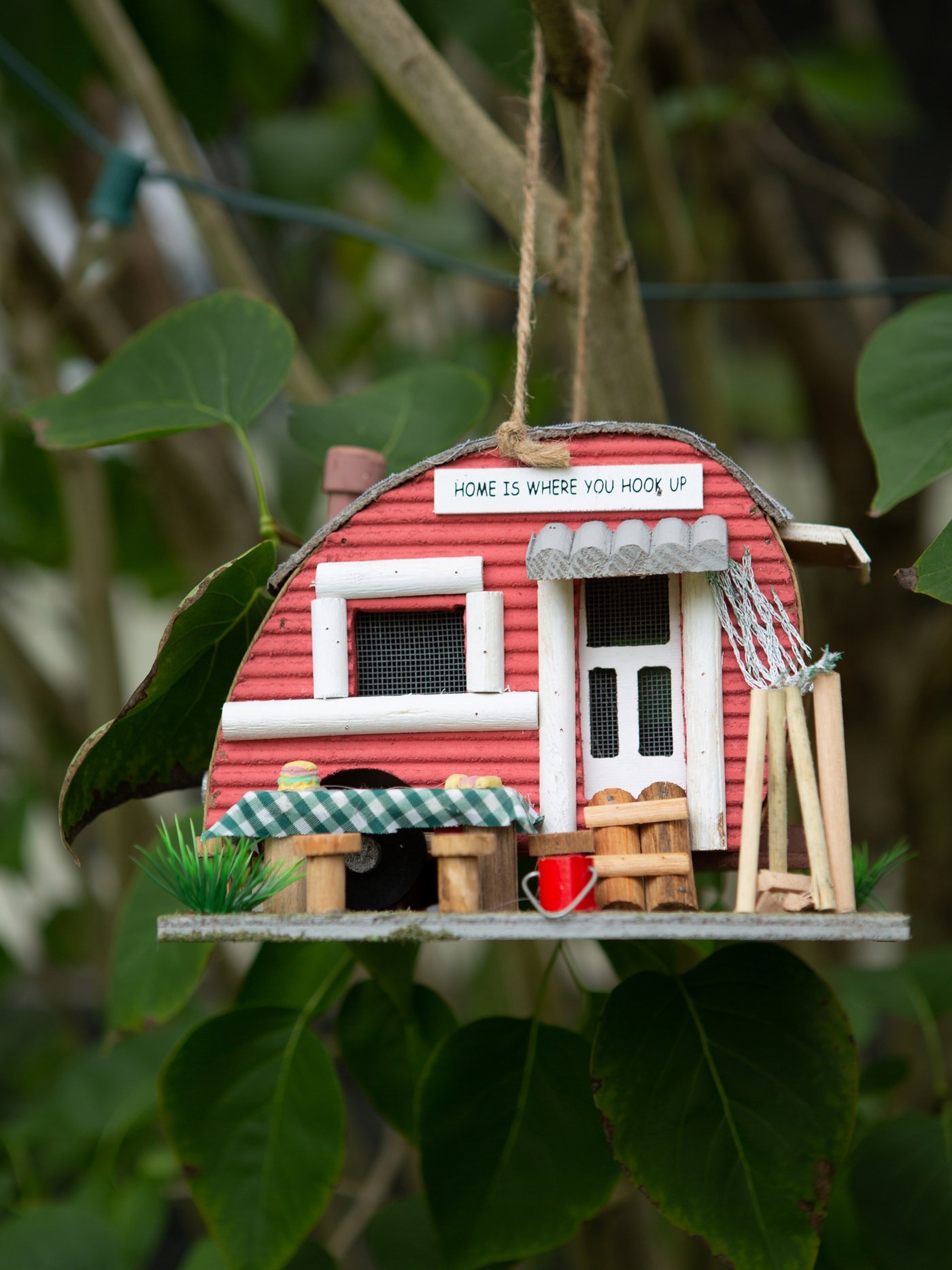 Create a comfy campground for your fly-in guests with this cozy little trailer! Comical birdhouse comes complete with all the accessories of an old-time outdoor paradise.