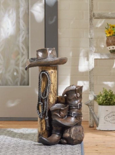 This ranch-style accent is loaded with authentic cowboy styling for a delightfully different take on garden décor. Real rustic weathered finish makes it an instant perfect fit for the great outdoors!