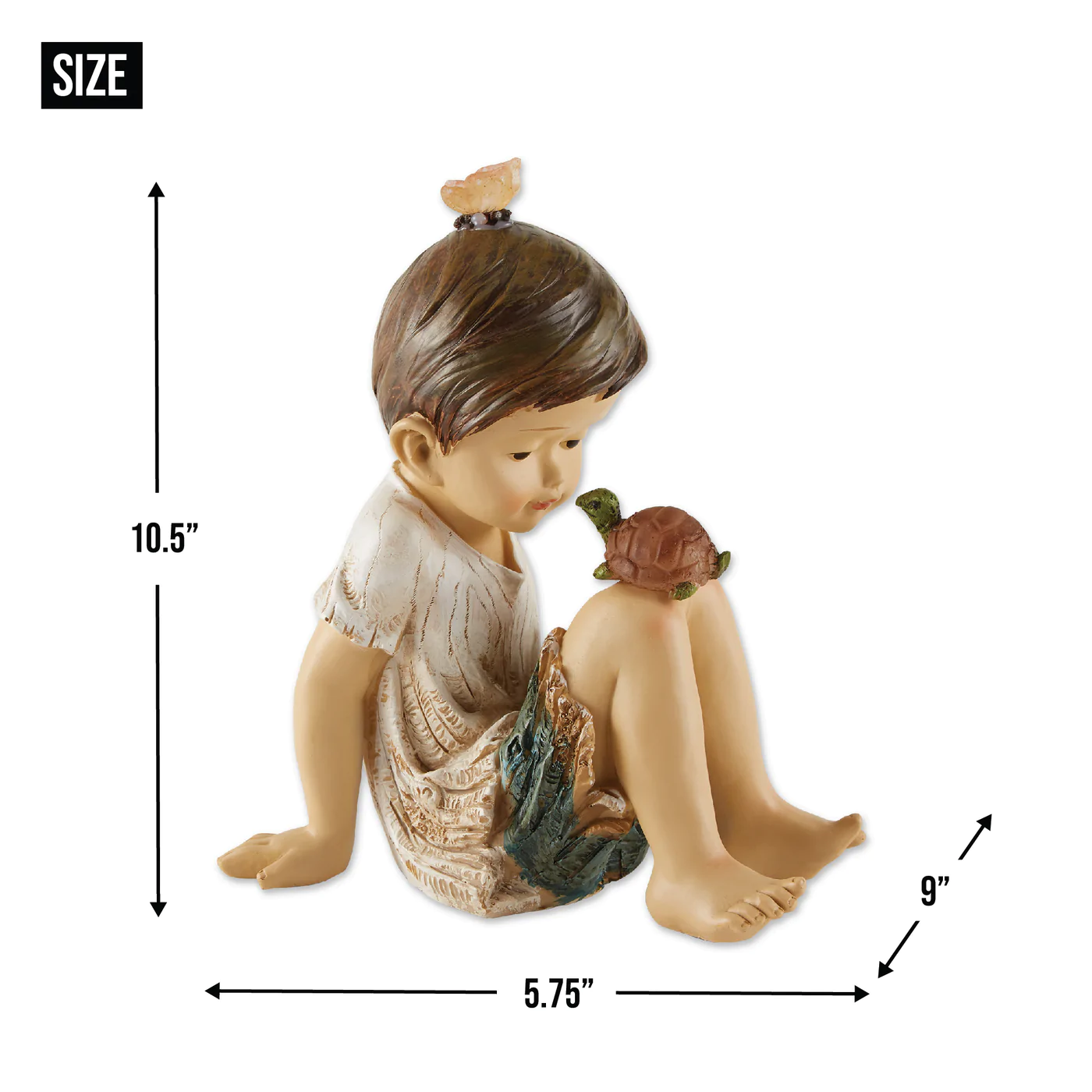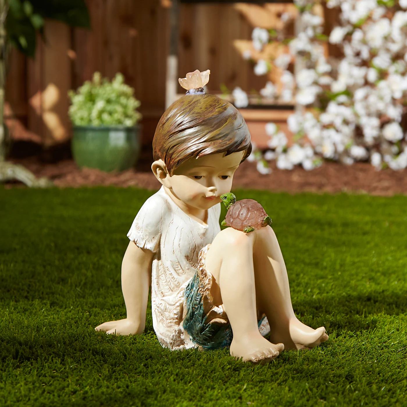 A bright-eyed boy shares a playful moment with his beloved pet turtle and a visiting butterfly joins in the fun. Makes a playful lighting and décor addition to either your indoor or outdoor space!