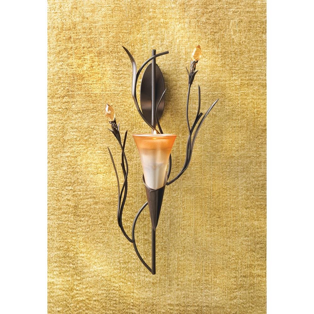 A delicate sunrise orange lily blossom, twining vines, and crystalline buds makes for colorful wall decor. With the addition of your favorite tealight candle or LED, this wall sconce becomes a stunning combination of ornate sculpture and glowing light!