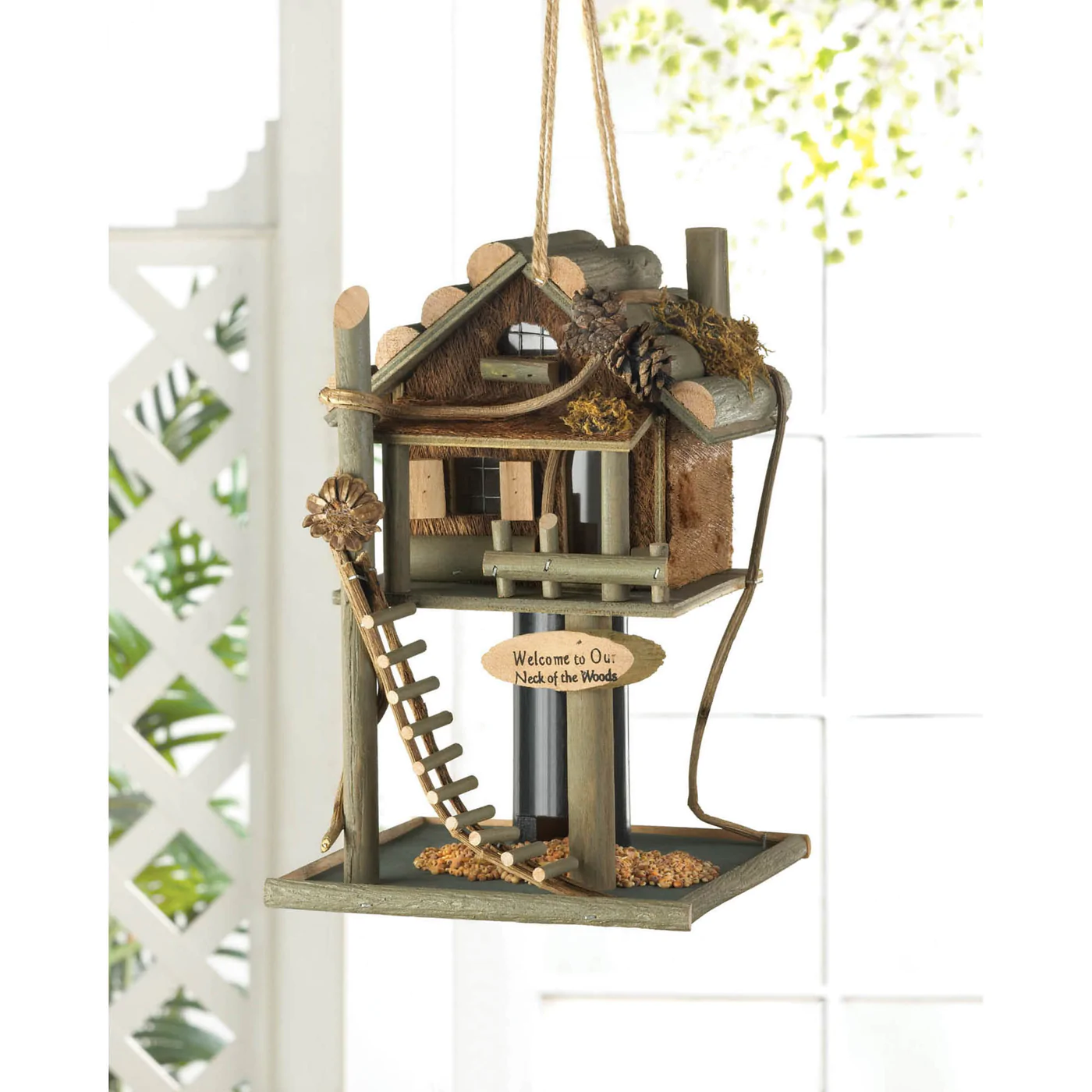 Welcome birds to your 'neck of the woods' with this fantastic wooden way-station! Trimmed with twisty twigs, pinecones and a darling rough-hewn ladder, this bird feeder is the perfect stopping point for your feathered friend’s journey. Open up the roof to conveniently store bird seed inside the house. The seed falls down the center chute and pours out onto the tray base below where birds can perch and feed.