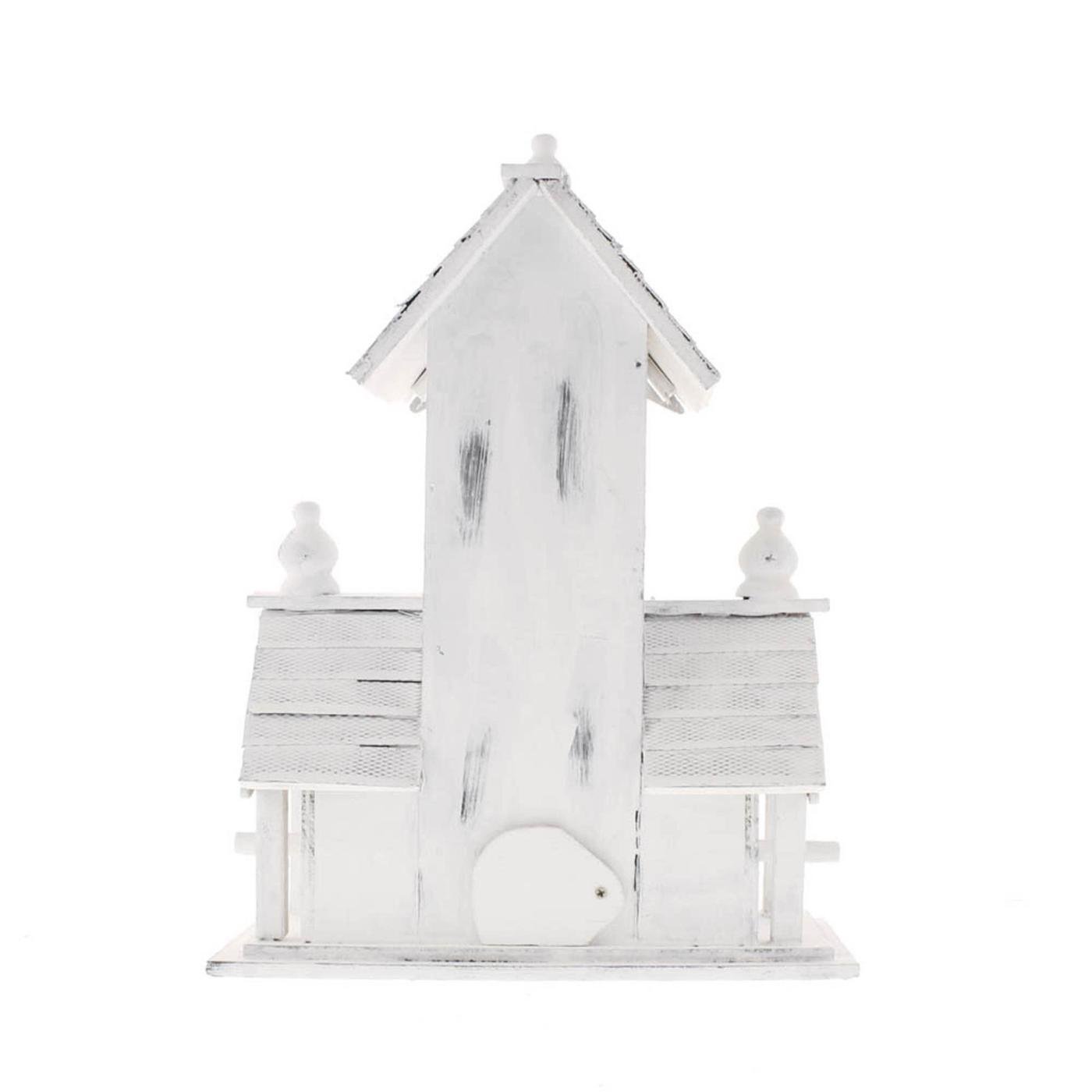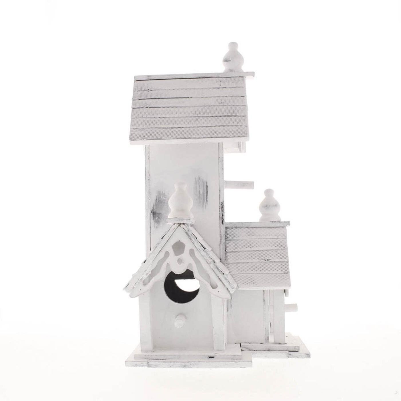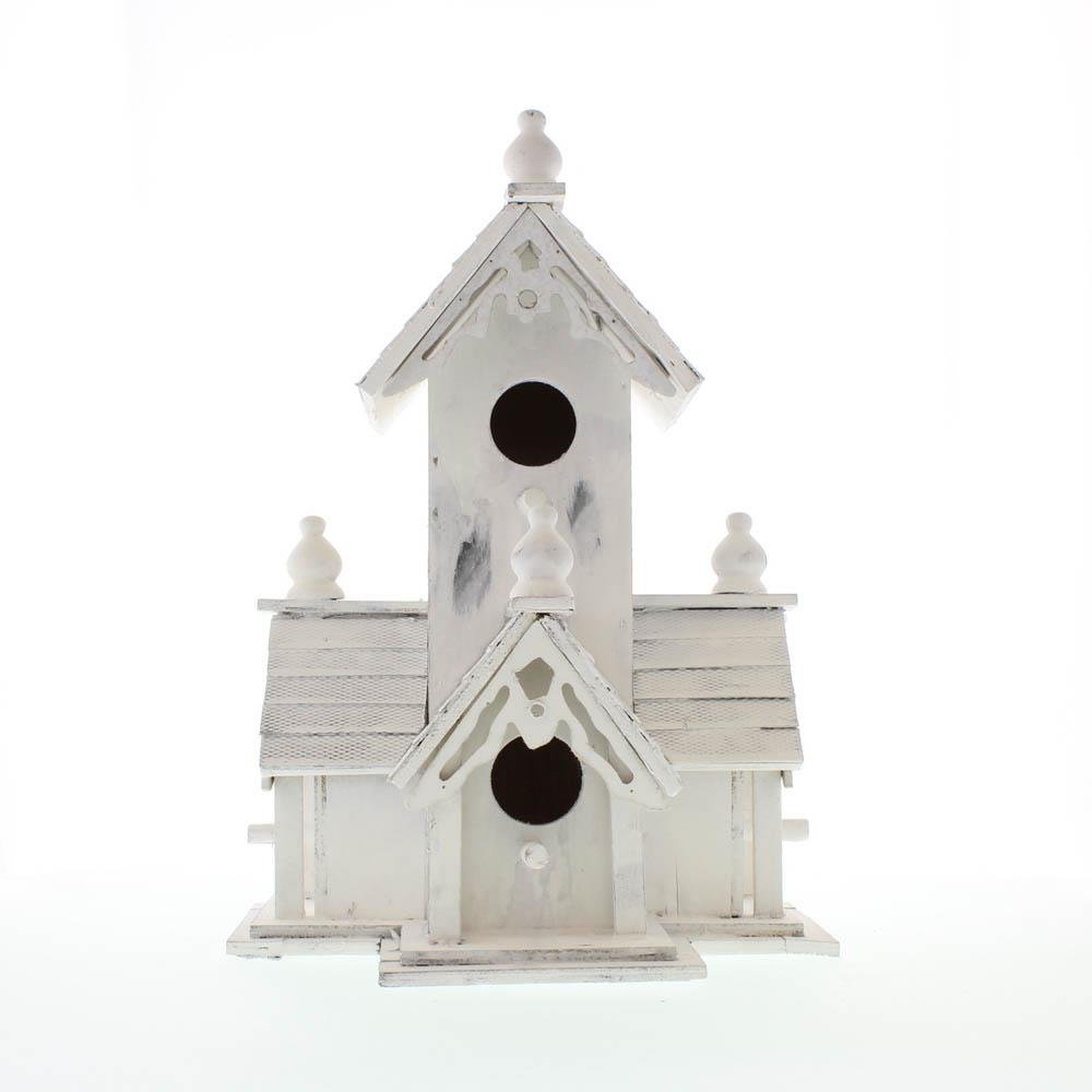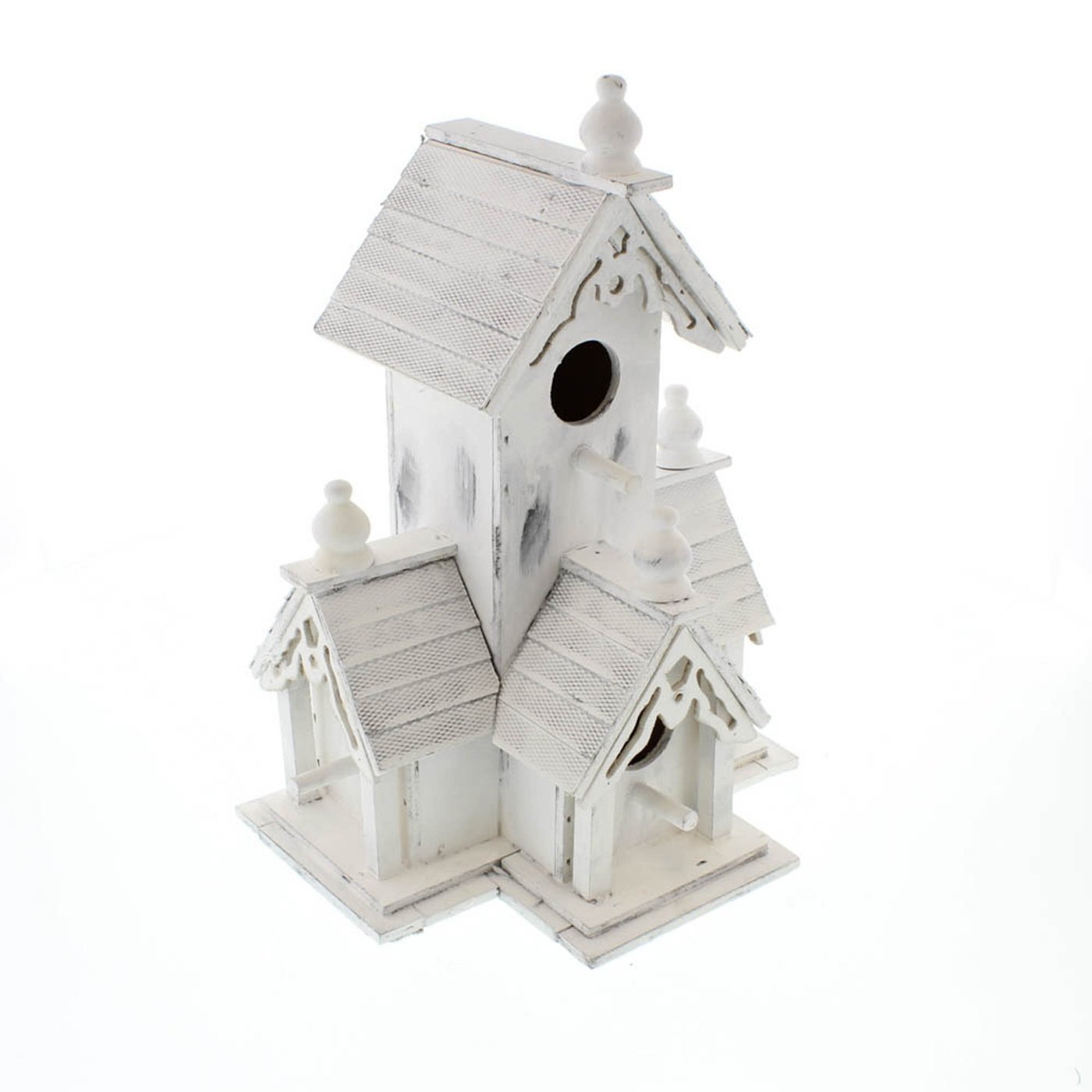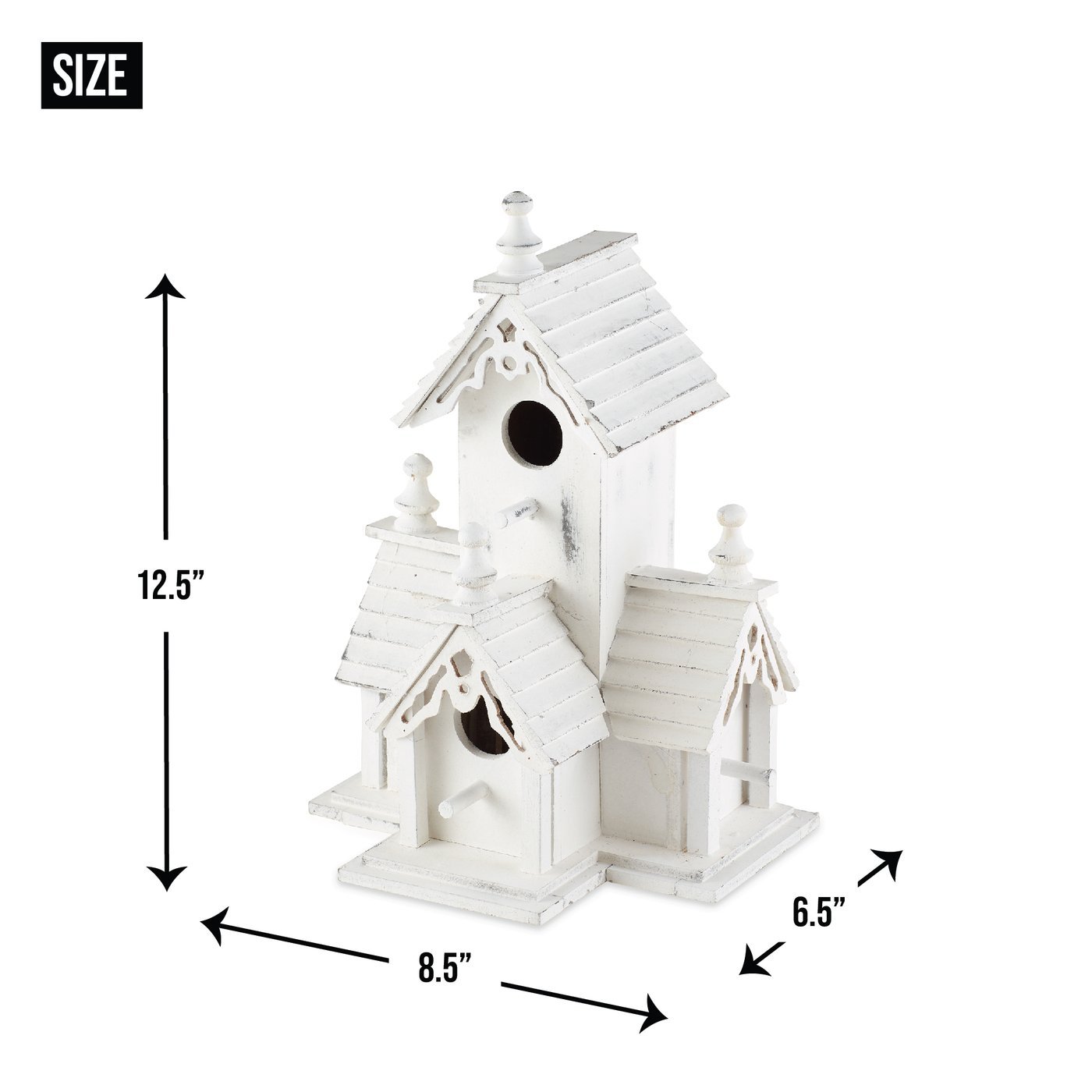Victorian-style birdhouse features distressed white-finished wood, multiple entrances, and detailed wood trim with an heirloom look.
