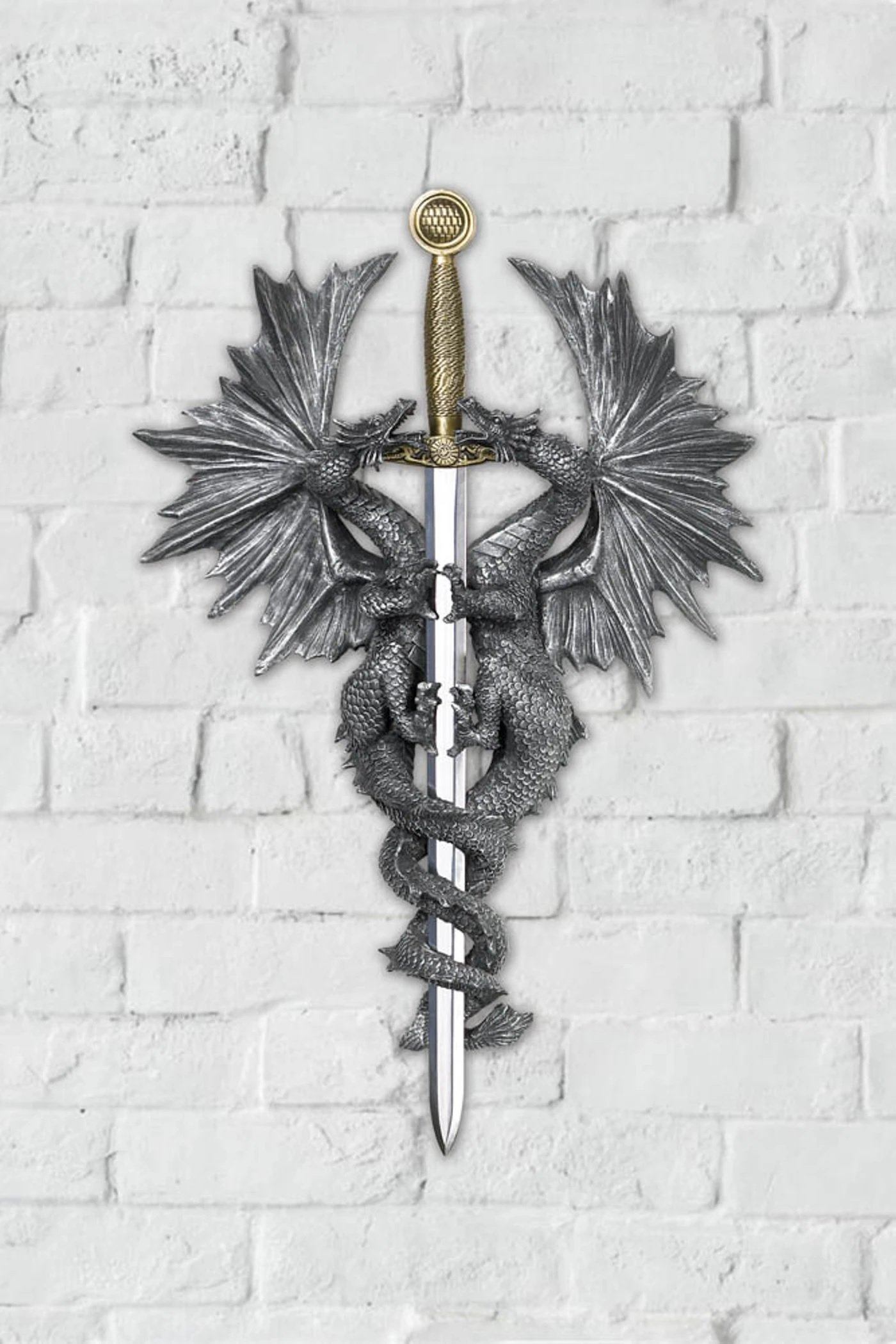 An impressive display of medieval mythology, as a pair of dragons entwine around a formidable dagger. Turn any room into a medieval fantasy castle with this mythical wall decor!