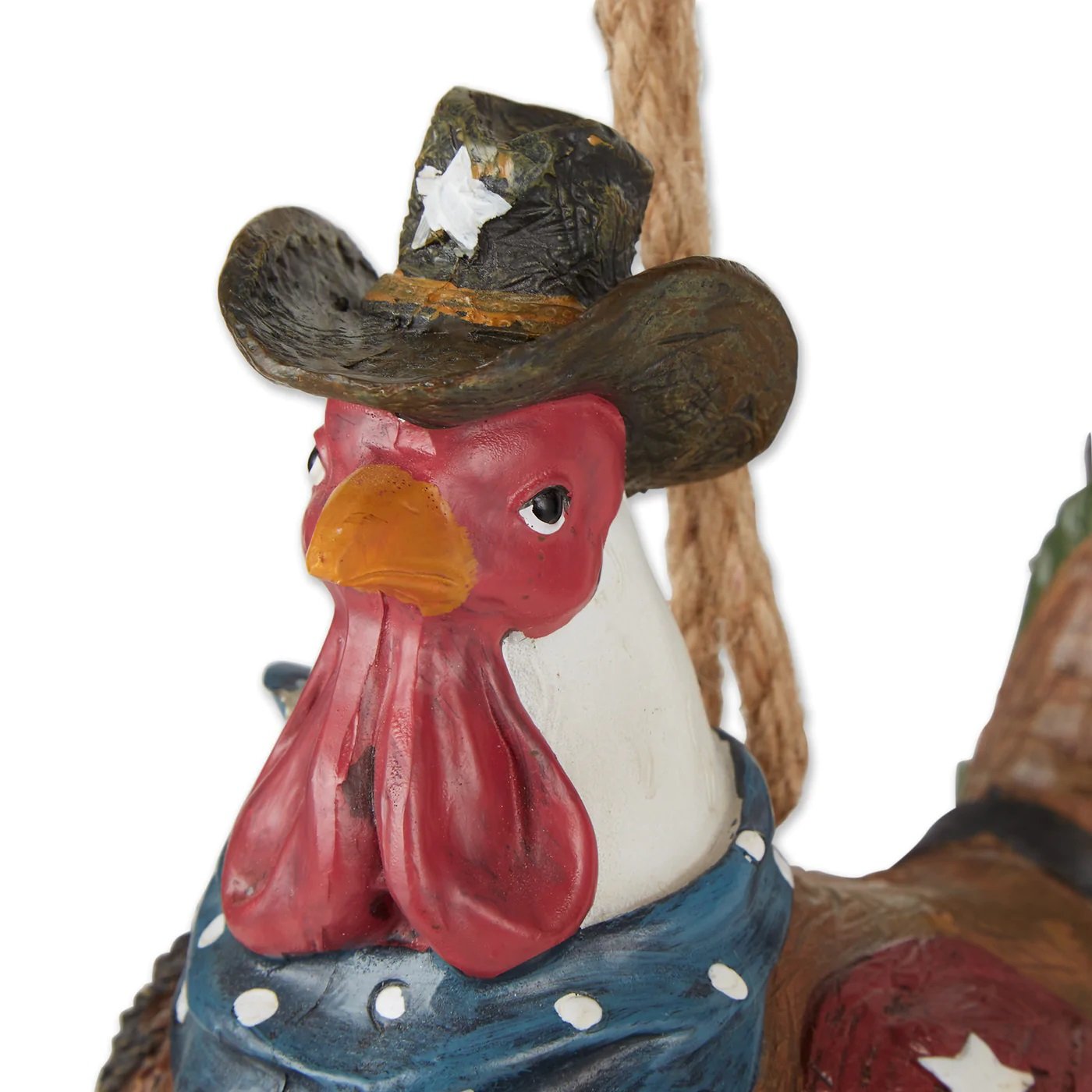 All dressed up in his Western finery, a plump brown 'bucka-rooster' offers ample shelter to his fellow feathered friends. Free-swinging cowboy boot feet dance an amusing two-step in the slightest breeze!