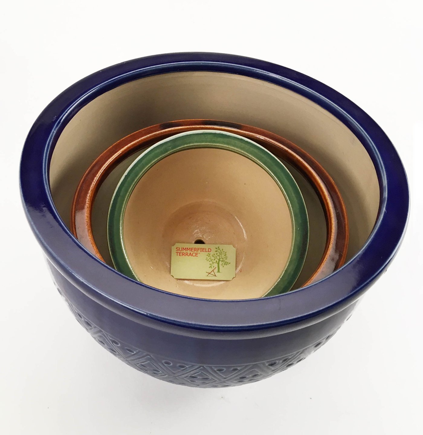 Bring a burst of color to your garden! Embossed earthenware flower pots are sumptuous in shades of azure, topaz and peridot. Set includes three separate sizes to hold a variety of your favorite greenery! Drain hole at bottom of each pot.