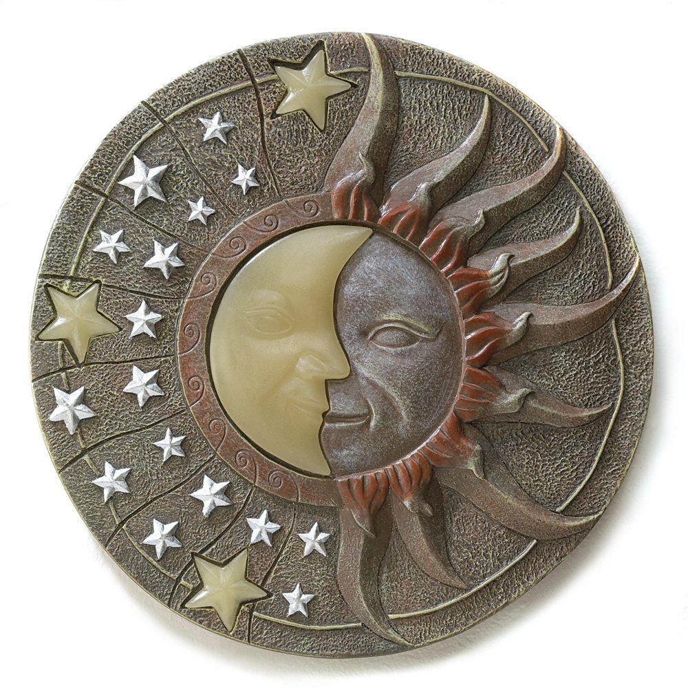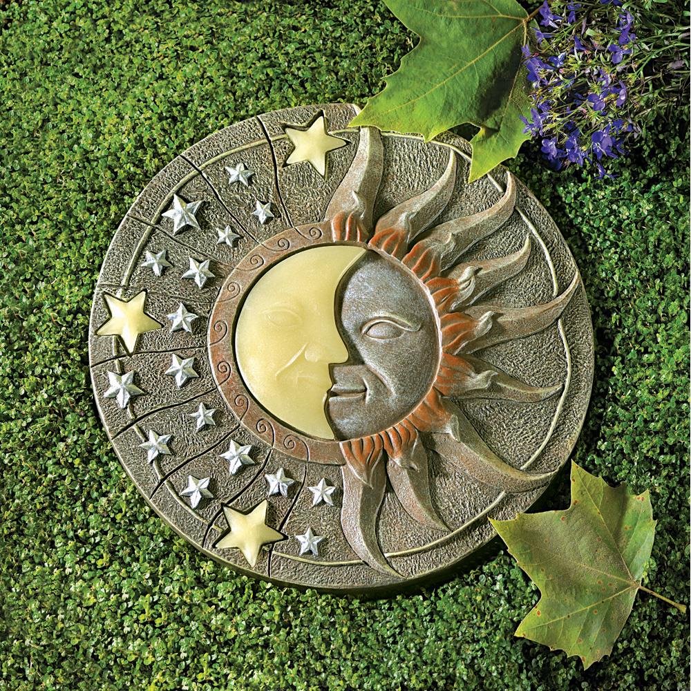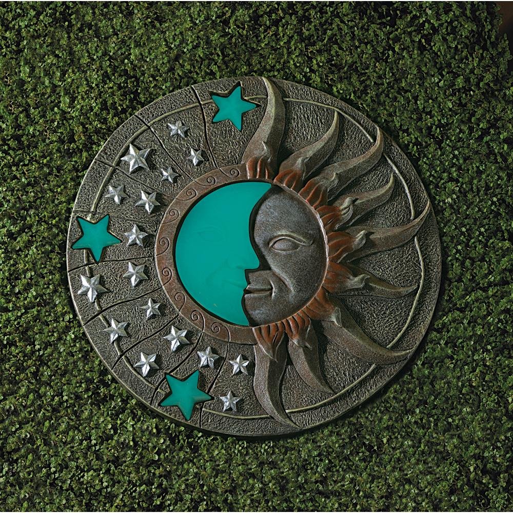 Lovely by day, and magical by night— place this celestial plaque in a sunny spot to enjoy a beautiful glow-in-the-dark moon and stars image! Stone-look circular plaque makes a beautiful stepping stone. A striking piece of garden art!
