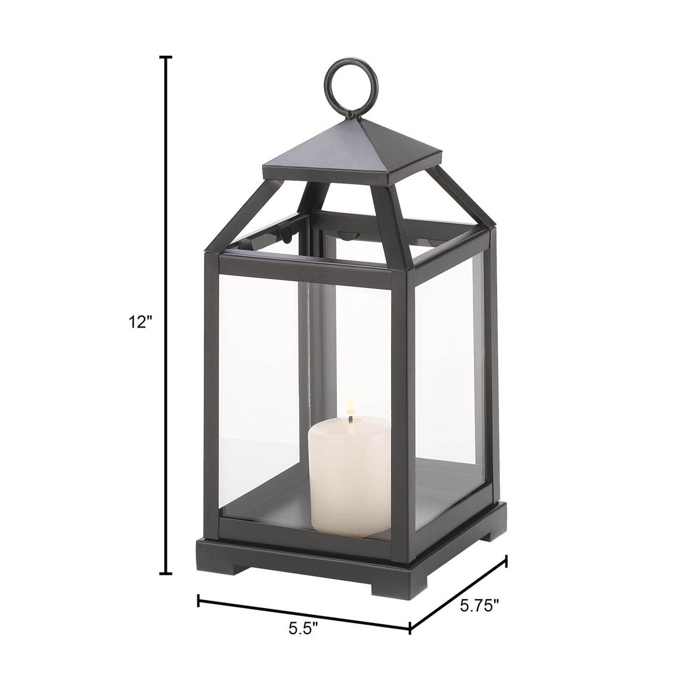 Squared glass-paned lantern gets geometric appeal from a simple silhouette and classic matte-black finish. Safely houses a stately pillar candle for hours of enchanting light! Loop at top for hanging; can also stand freely on table or shelf.
