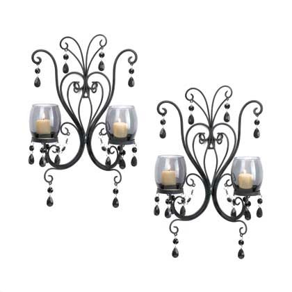 Dark and mysterious, this pair of wall sconces will turn candlelight into a dramatic lighting accent with two smoked glass candle cups set in a scrolling black metal frame.