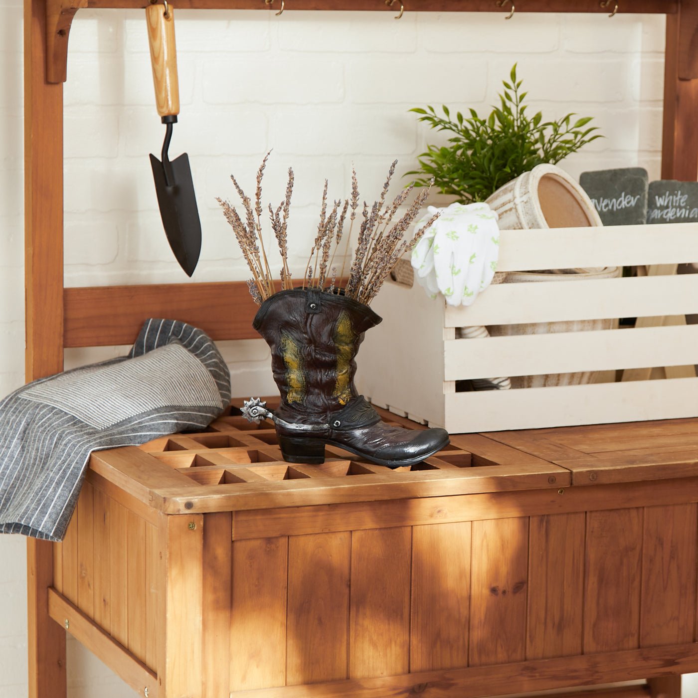 Let your favorite flowers or plant saddle up in this charming cowboy boot planter. This planter has plenty of Western flair and looks like a well-worn and weathered boot, complete with a spur on the back.