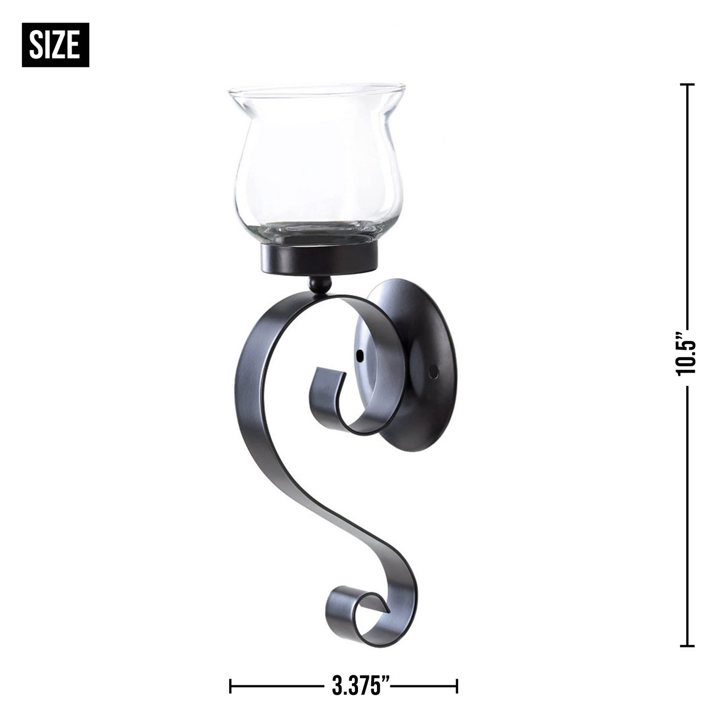 The wall sconce weighs 0.8 lbs. and measures 3.38 inches by 3.75 inches by 10.5 inches. Glass holder: 3 3/8" x 3 3/8" x 3 1/2" high.