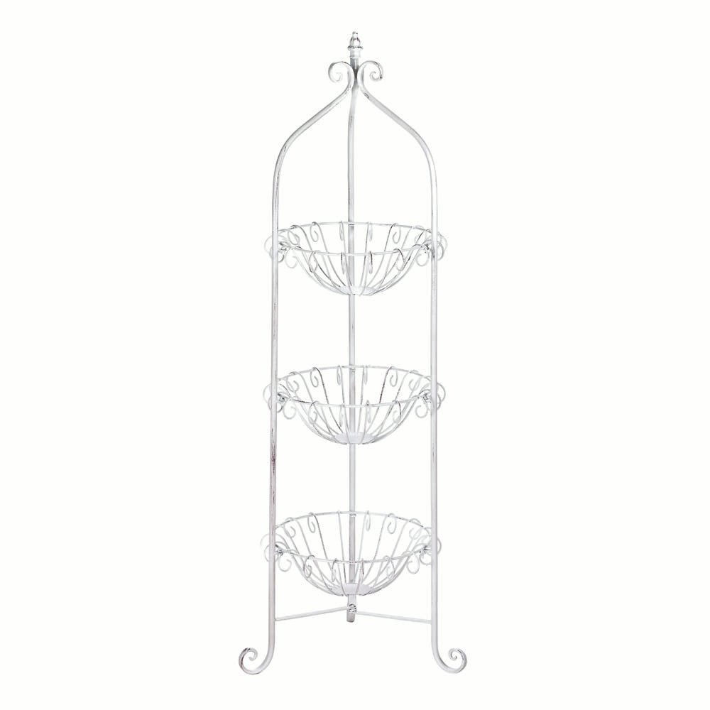 Three curled metal wire baskets stand in a metal frame, complete with curled feet and a finial on top. Fill it with three of your favorite plants or blooms, or let your imagination fill these baskets with whatever you'd like to display.