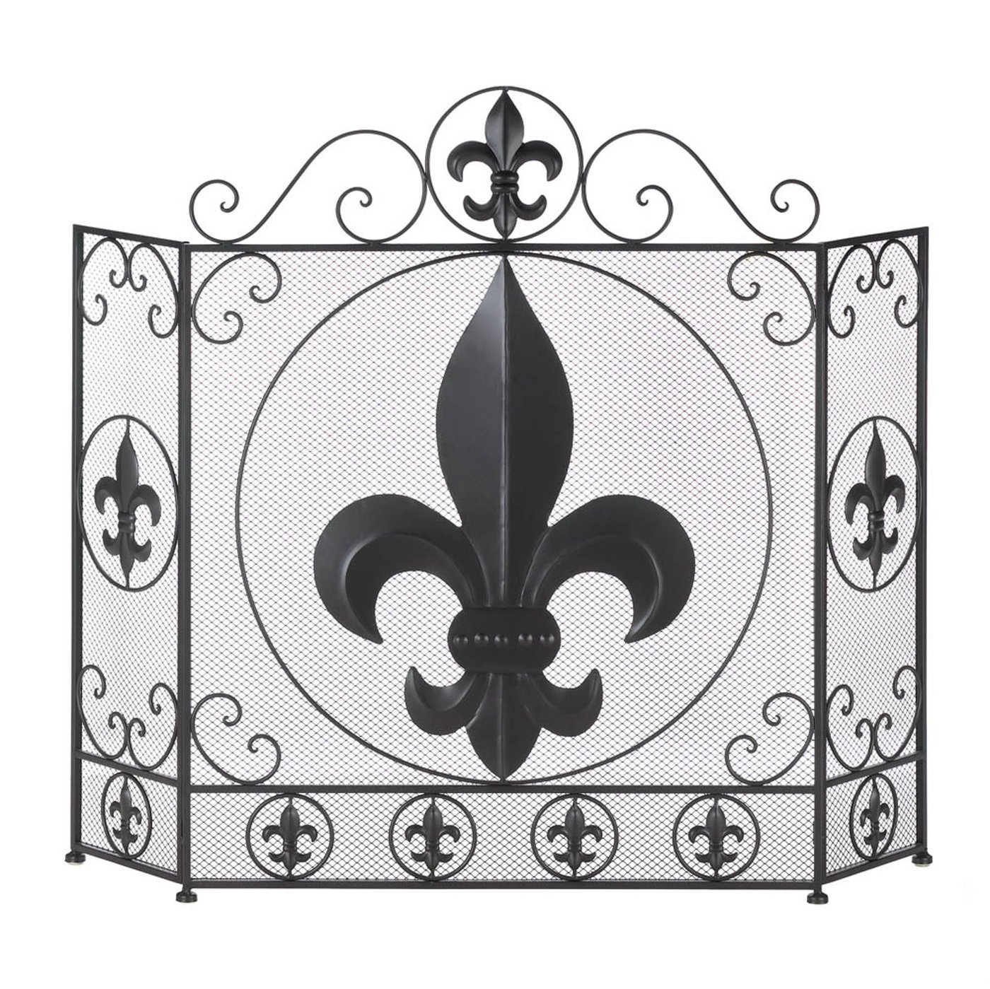 This stylish fireplace screen makes a big statement in your chic decor. The center panel of this tri-fold screen features a large fleur-de-lis symbol surrounded by metal flourishes and smaller versions. The side panels mimic the central design and are adjustable to fit into your space.