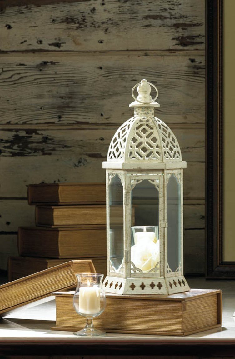 Where graceful design and vintage patina meet, you'll discover this beautiful candle lantern. The frame is iron, finished in distressed vintage-style white, and the clear glass panels let the light from your favorite candle shine bright.