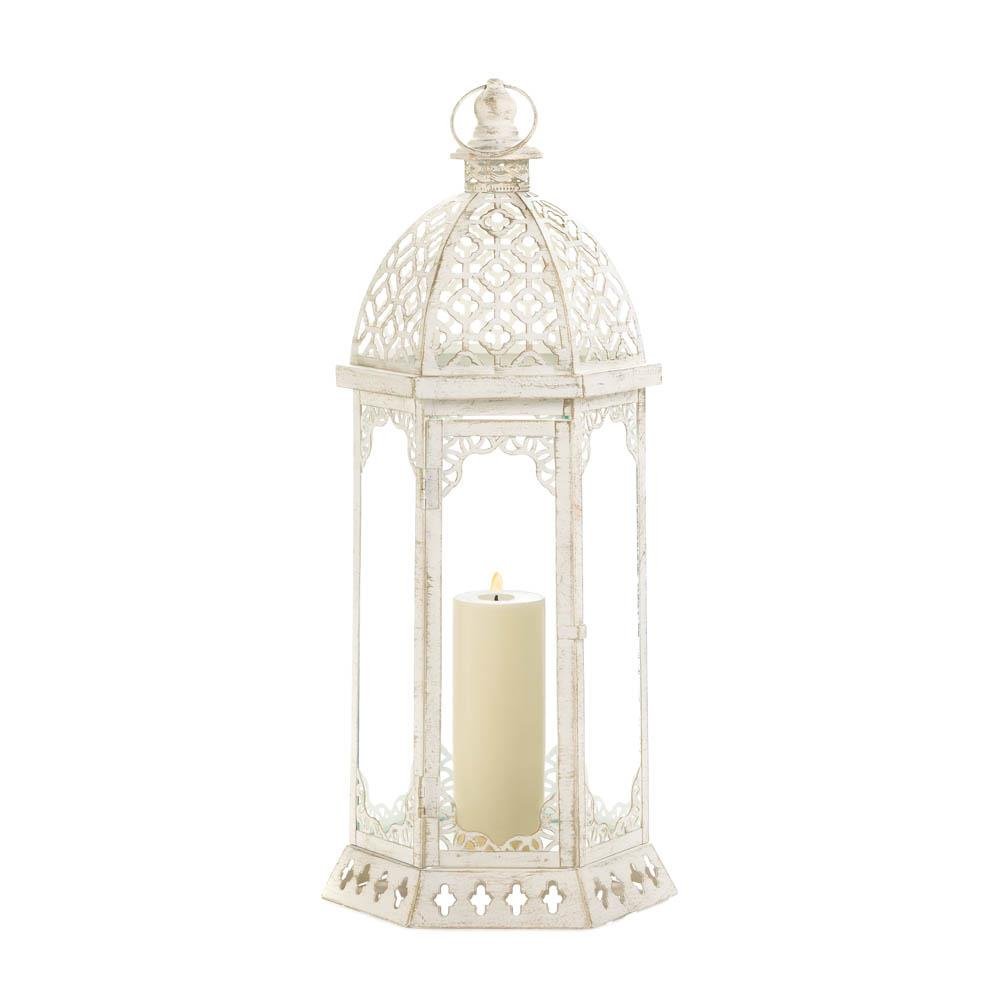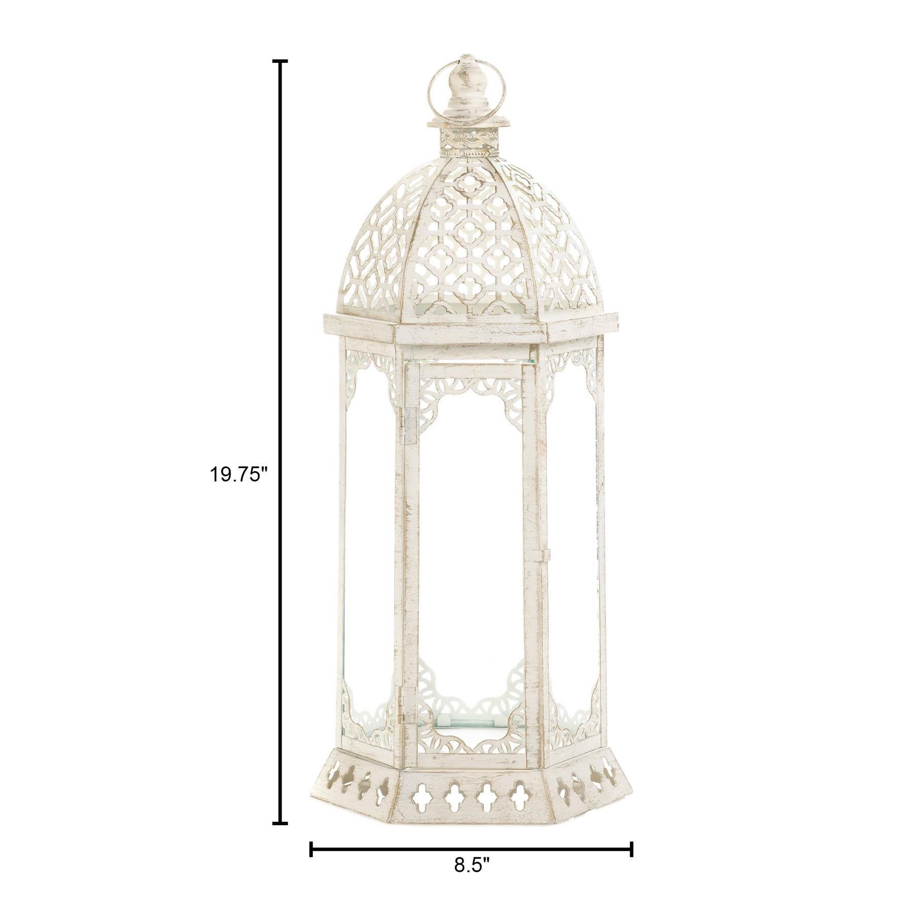 Turn candlelight into a grand affair with this glorious iron candle lantern. Its vintage white finish is the perfect complement to its embellished cutouts and flourishes, and the clear glass panels are the perfect way to showcase your favorite candle.