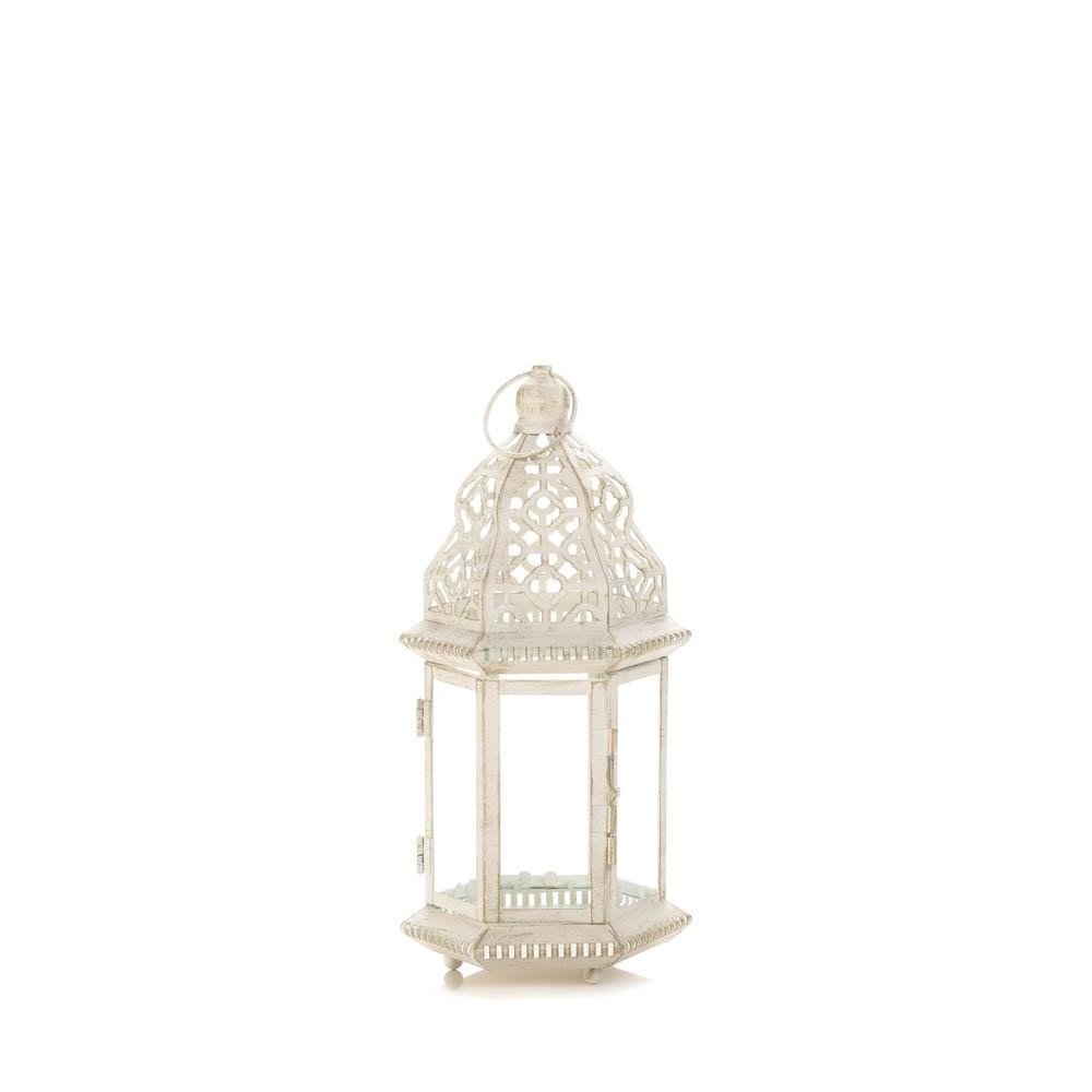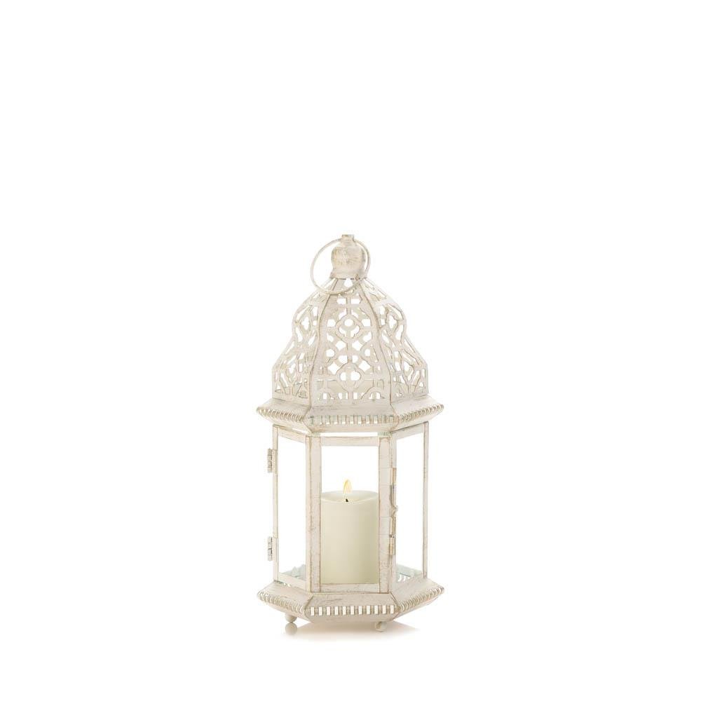 A little bit of candlelight will go a long way when you light your favorite candle inside this beauty. The iron frame has a vintage white finish that perfectly showcases the intricate cutout details and flourishes.