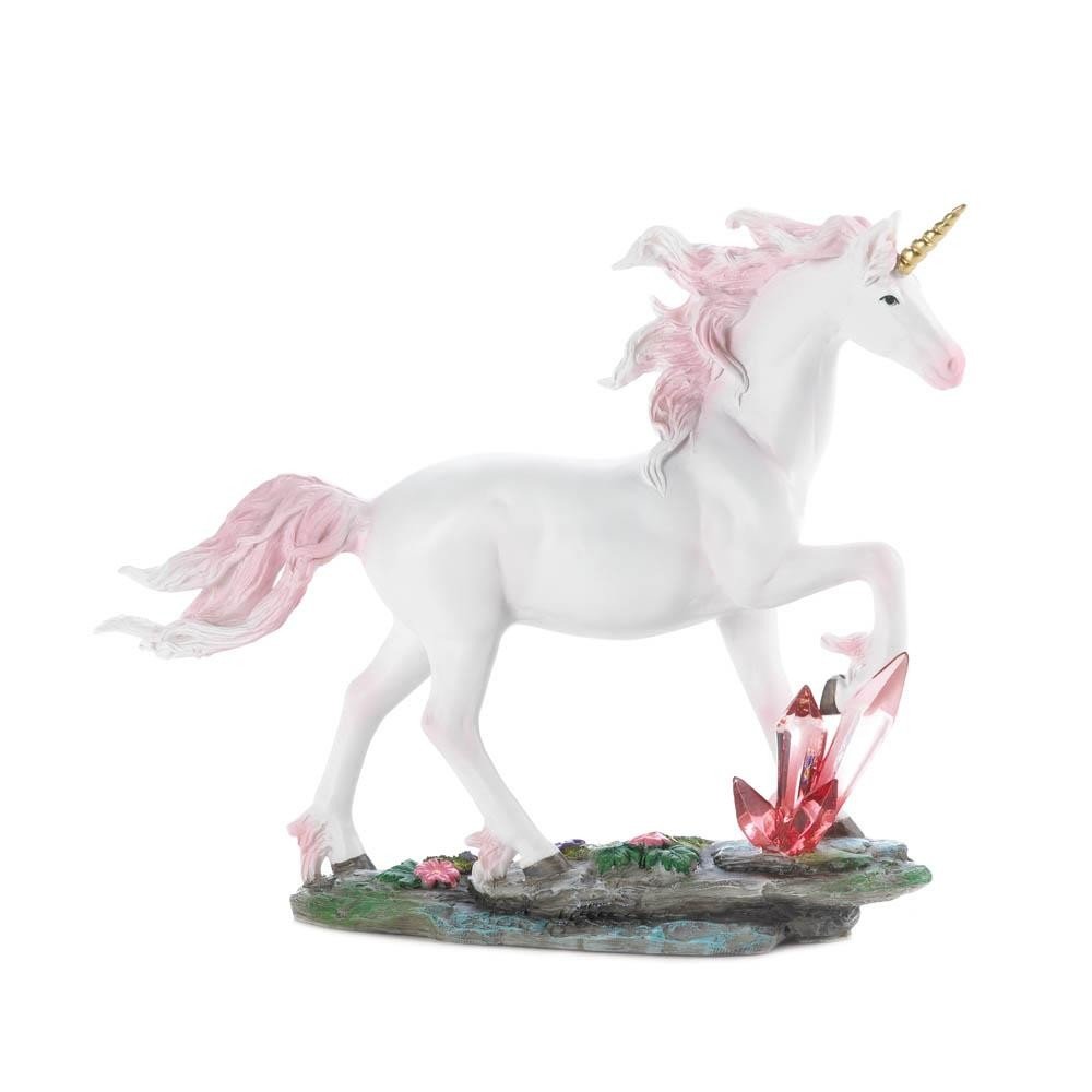Enchant your living space with this mythical and magical figurine. A beautiful white unicorn with a golden horn and pink mane and tail strides through a magical land that's filled with crystals and flowers. This mesmerizing décor piece is an excellent gift and will look stunning perched on a shelf, desk, or table.