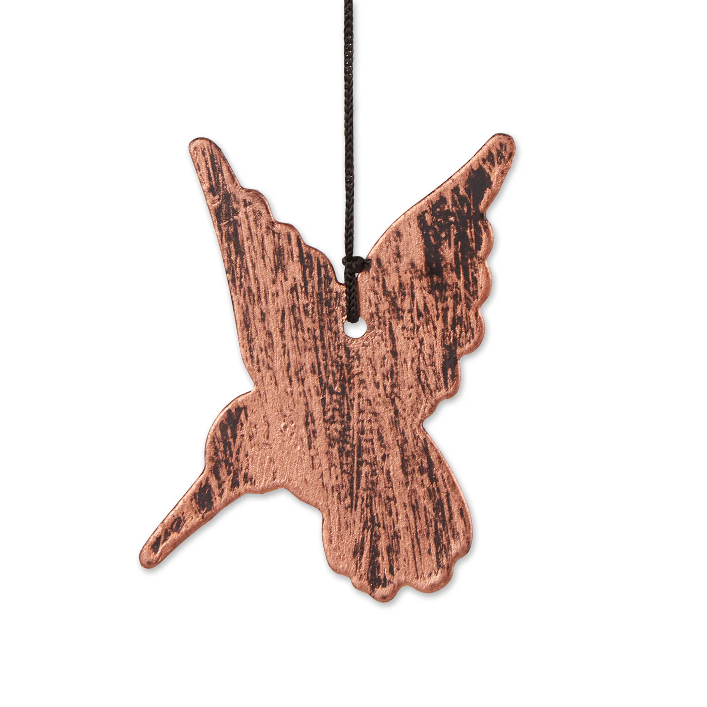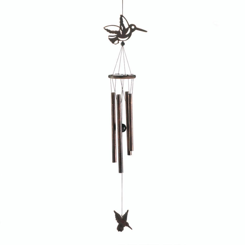 When the wind flutters through this beautiful wind chime, it will fill your ears with tinkling music. This wind chime features a cutout hummingbird ornament on top and a lovely hummingbird charm below.